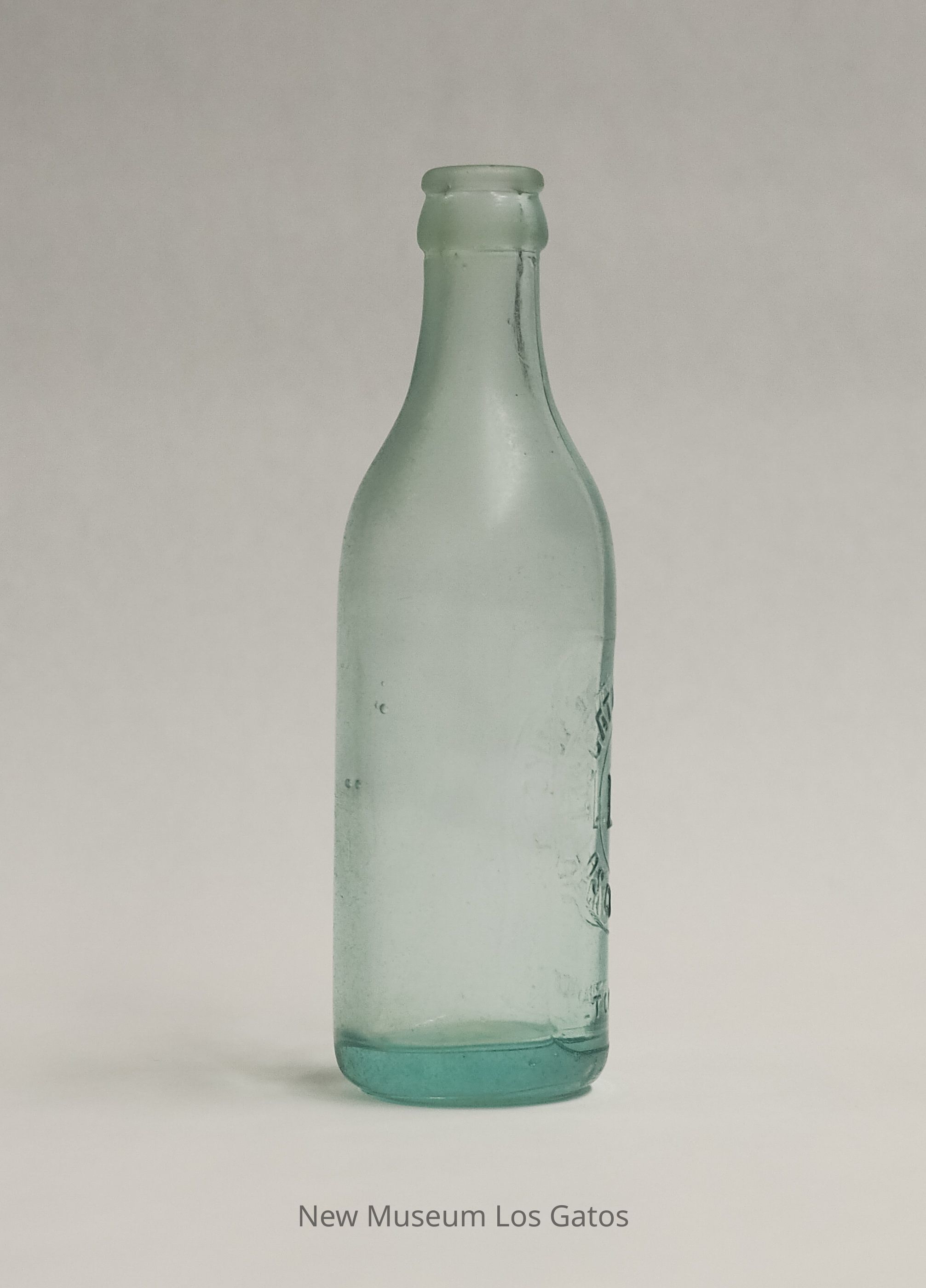 A clear and slightly matte bottle with a blue-green tint from Los Gatos Soda Works. Manufacturing information is embossed on one side.Collection