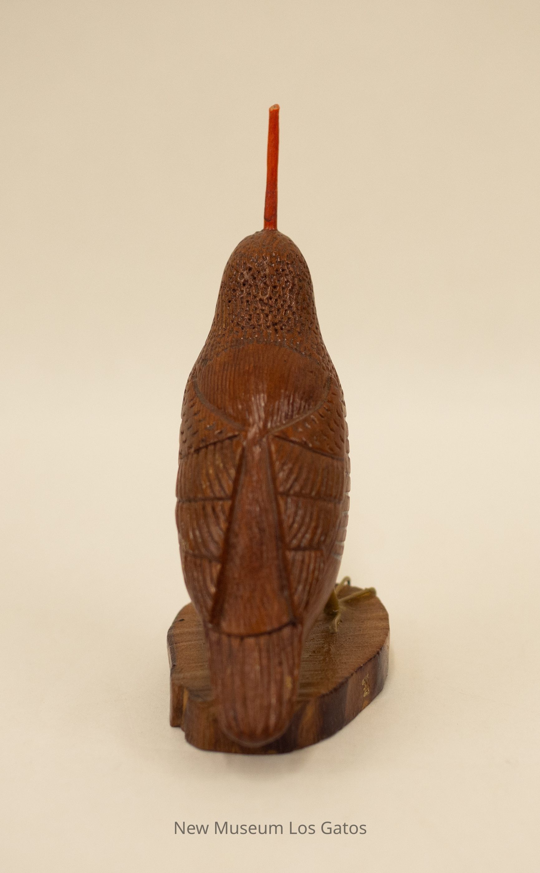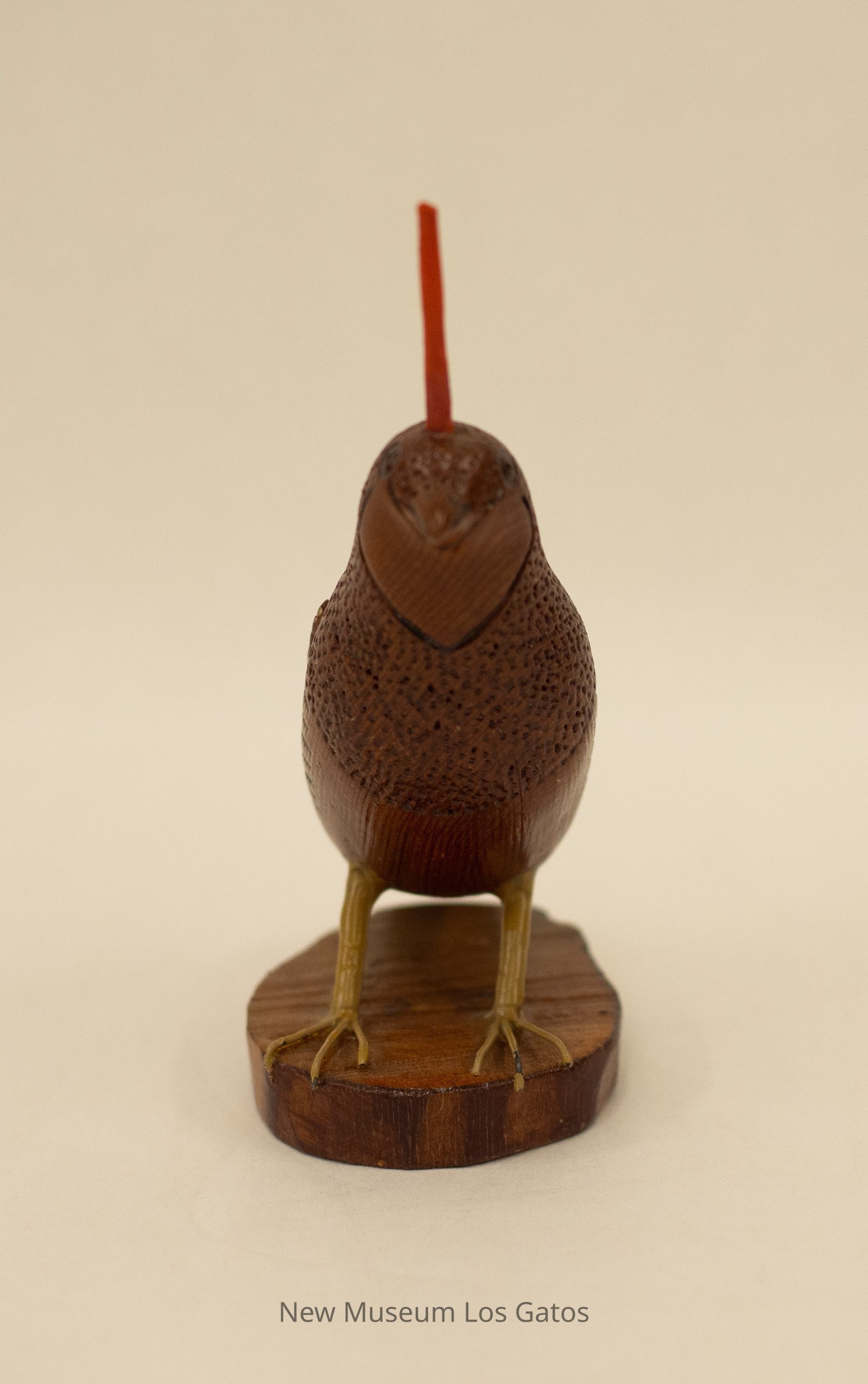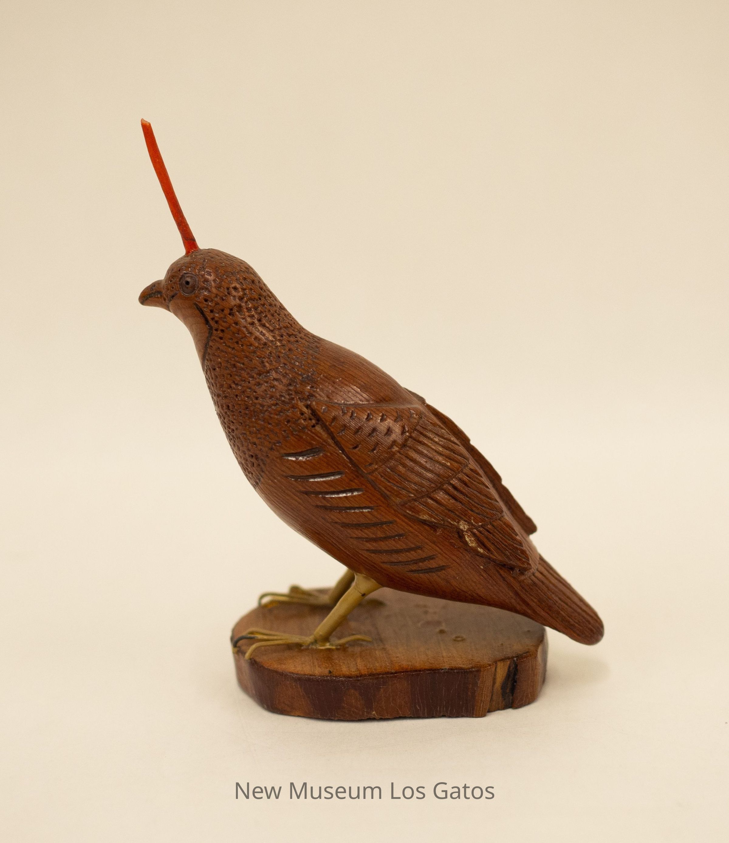 A reddish brown hand-carved wooden sculpture of a mountain quail. The bird has a red topknot and is standing on an ovular wooden base.Type of Sculpture