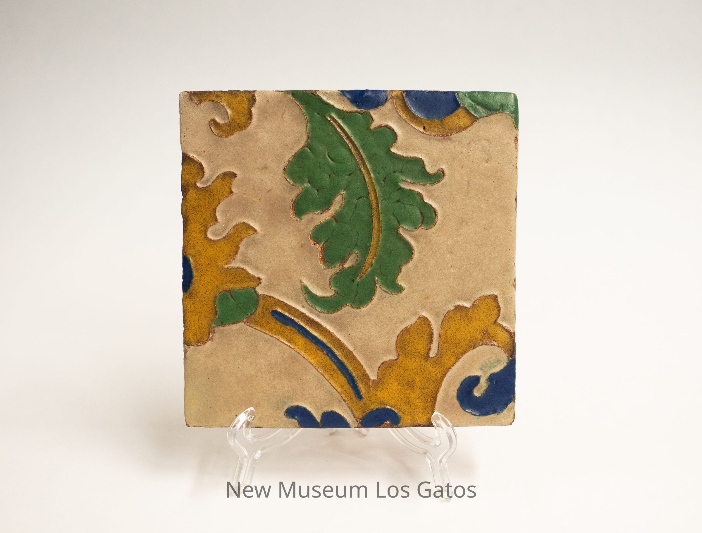 A square, decorative tile. The tile itself is red/terracotta colored, while the face has a light tan glazed background with colorful decorative elements, including a green leaf and yellow and blue flourishes.