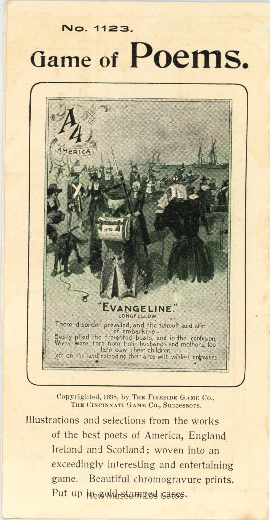Illustrations and selections from the works of the best poets of America, England Ireland and Scotland; woven into an exceedingly interesting and entertaining game. Beautiful chromogravure prints. Put up in gold-stamped cases.Language
