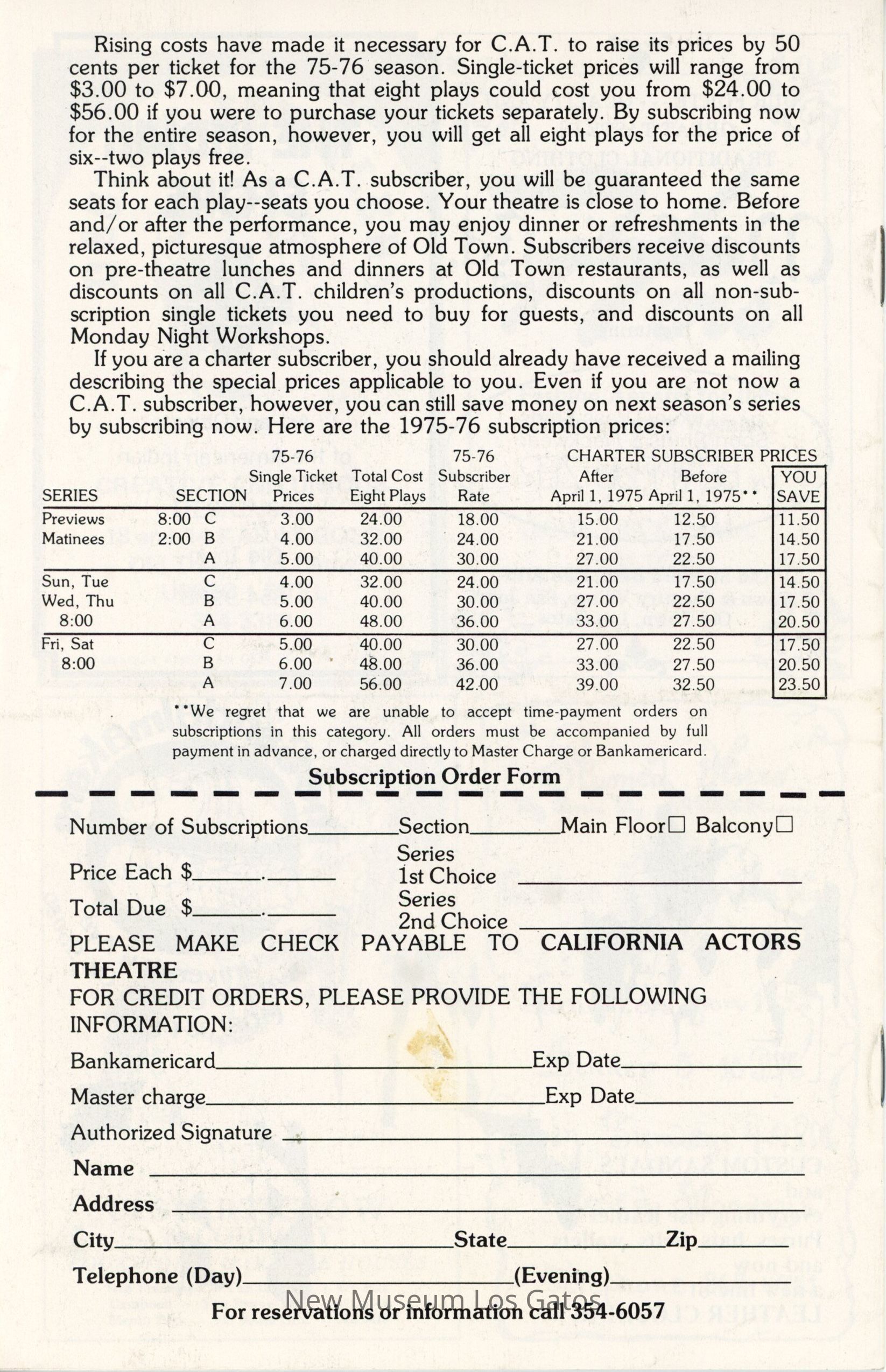 The show program/playbill for the California Actors Theatre 1975 production of "Detective Story." The program includes advertisements, a full cast list, bios and headshots of the company, general theater information, and more information about the rest of the season.Collection