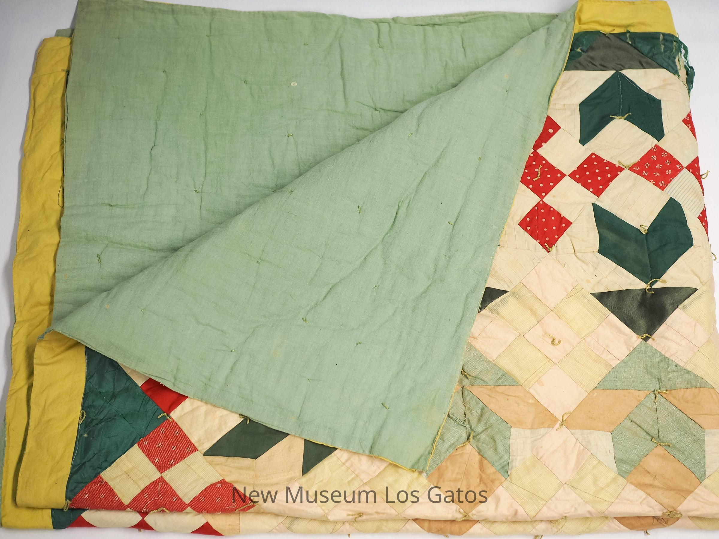 A quilt with light green lining, green, red, pink, and white patches, and a yellow border.Collection