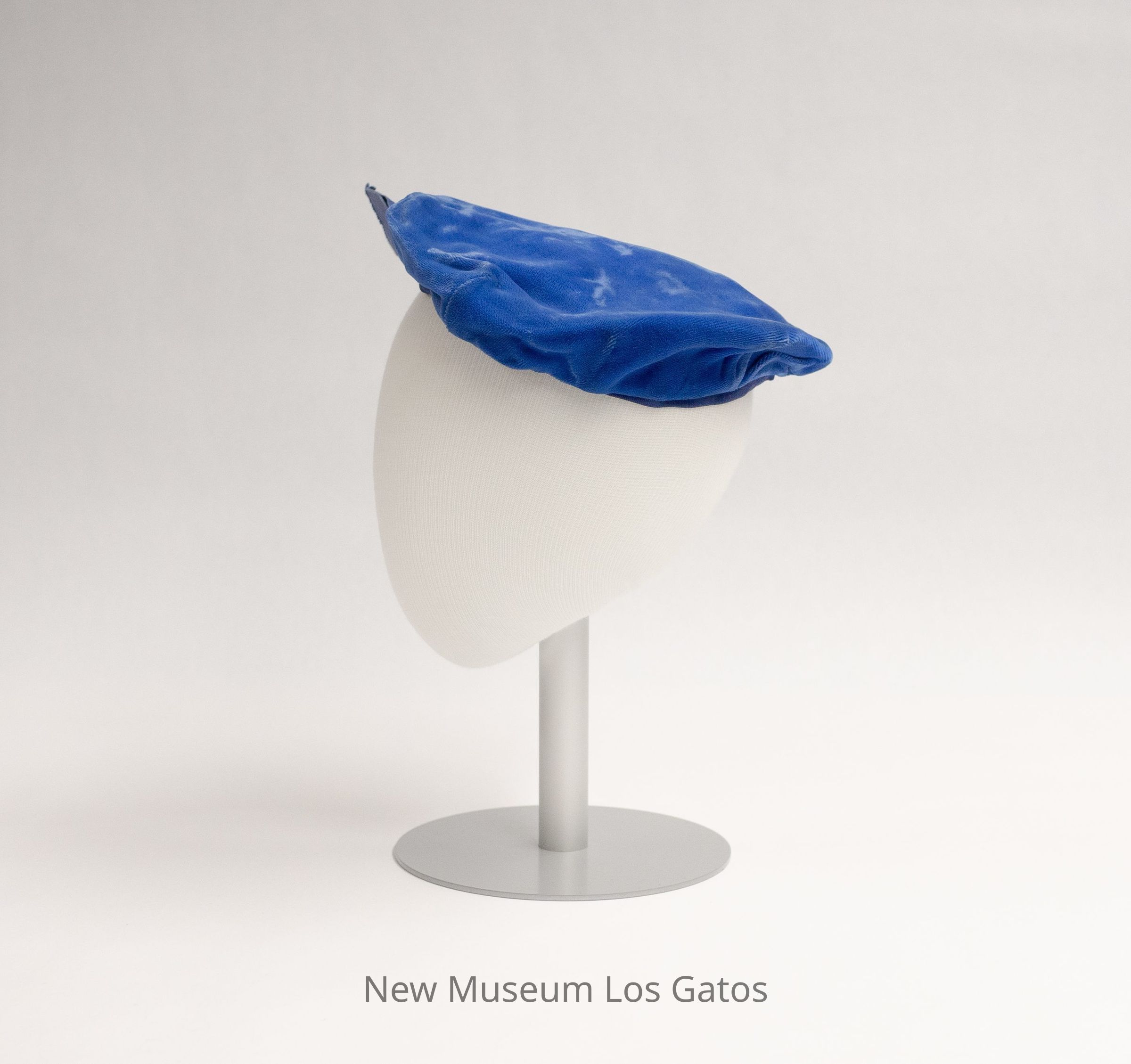A blue velvet beret, with navy blue ribbon trim around the bottom edge and a straight navy blue ribbon coming out of the front. The interior of the beret is black.
