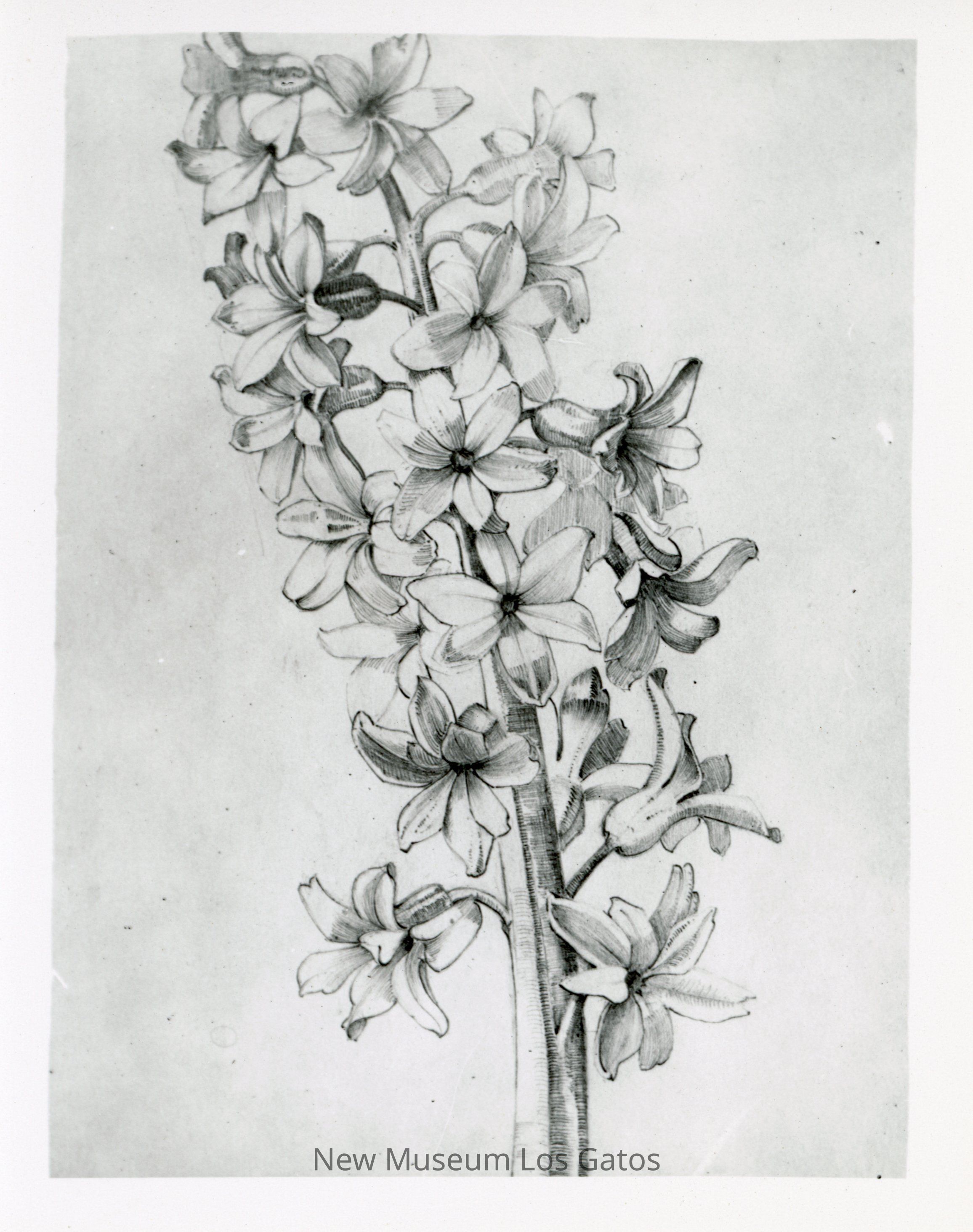Black and white photograph of an artwork depicting flowers, most likely a drawing.