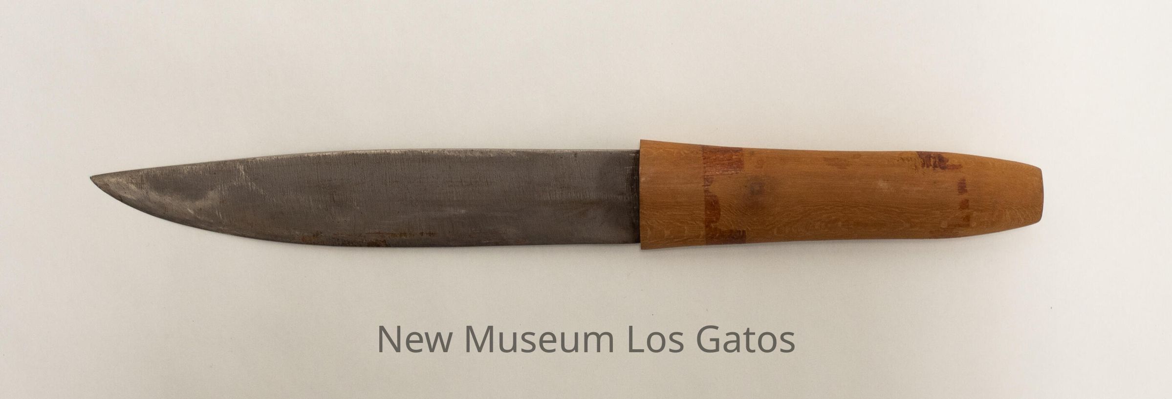 A homemade knife with a metal blade, a light brown wooden handle, and a light brown wooden sheath. There are three decorative, yellowish straps around the sheath.Collection