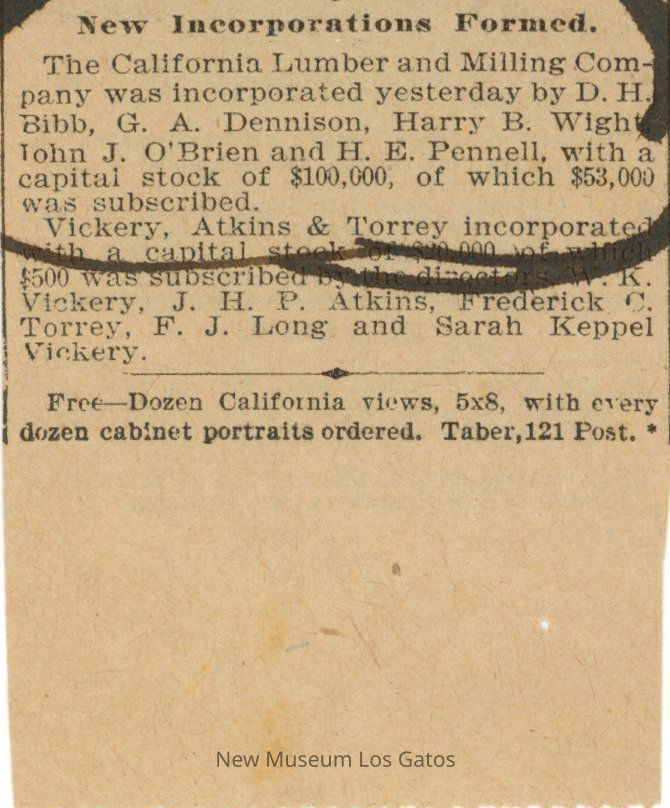 Small newspaper clipping with a list of new corporations formed in San Francisco, California at an unknown date. The corporation was founded by a group of men, including George Dennison and Harry Brewster Wright. The corporation formed is the California Lumber and Milling Company.Collection