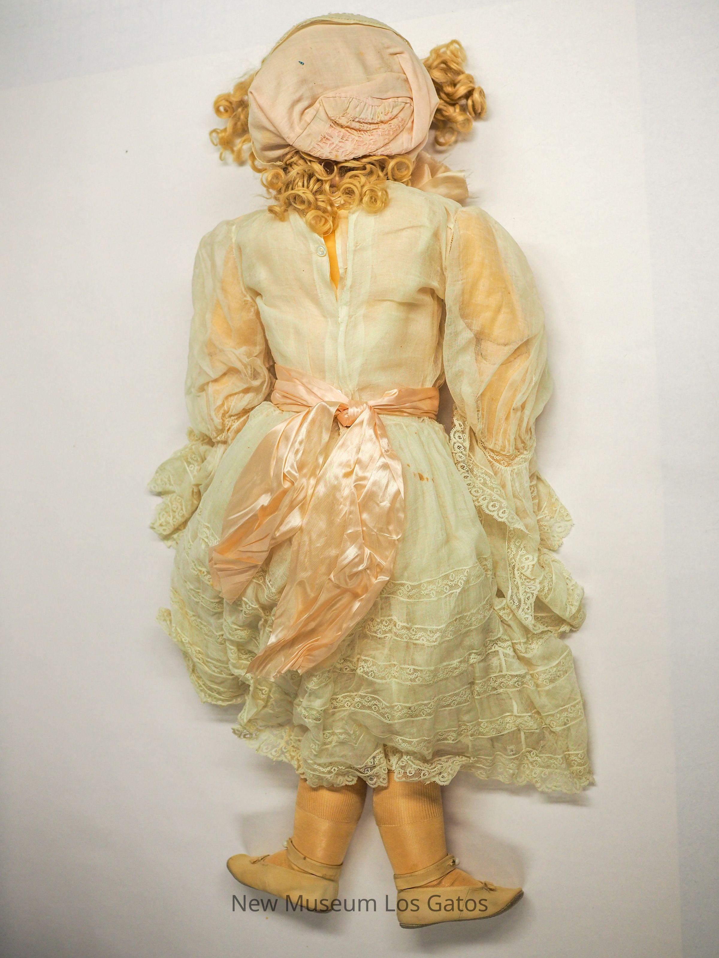 A large female baby doll with curly blonde hair and brown eyes. The doll wears a bonnet, and an off-white dress with a lace trim and light pink ribbon. In addition there are shoes, stockings, and a beaded bracelet. This doll's head is badly damaged due to a past fall.Collection
