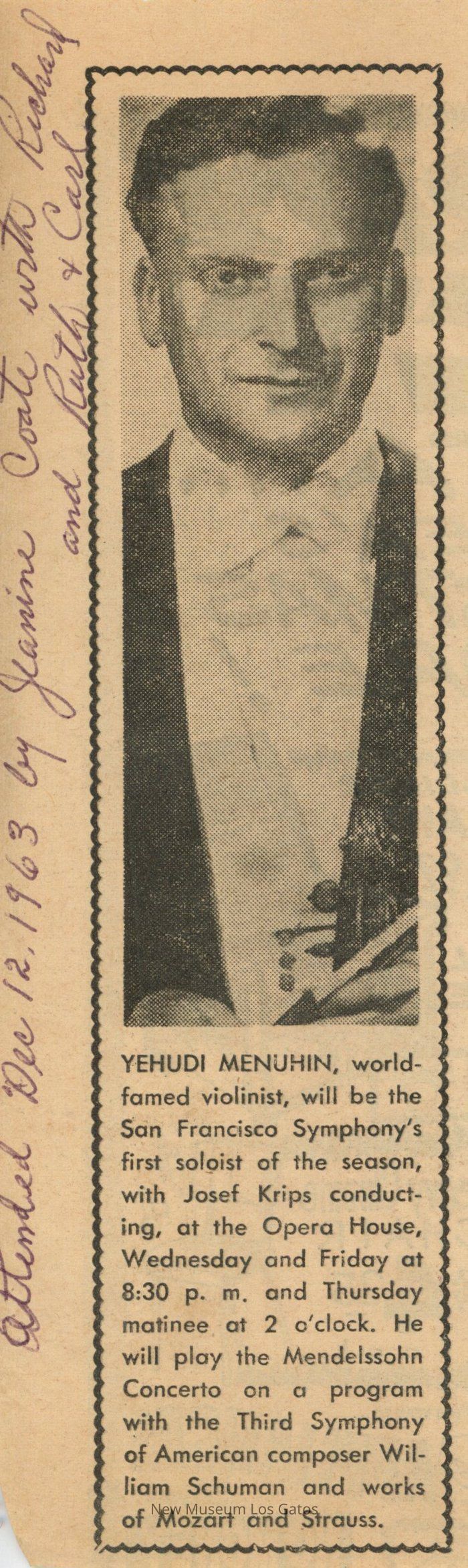 Small newspaper clipping with an article and photo of Yehudi Menuhin, performing at the San Francisco Symphony.Collection