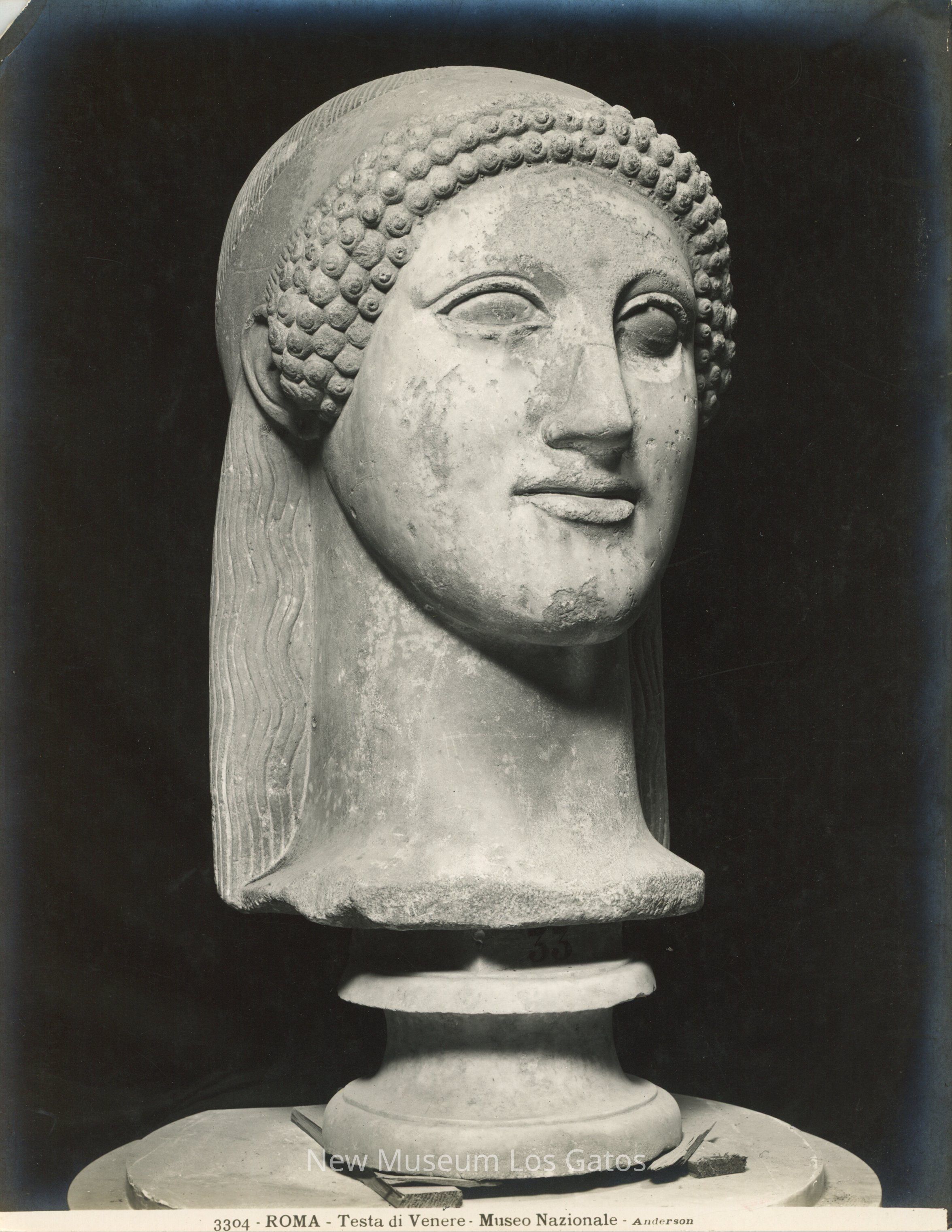 A black and white photograph of the statue "Aphrodite Ludovisi," displayed in the Palazzo Altemps in Rome. The statue is of a large marble woman's head, with long hair, curled around the face.Collection