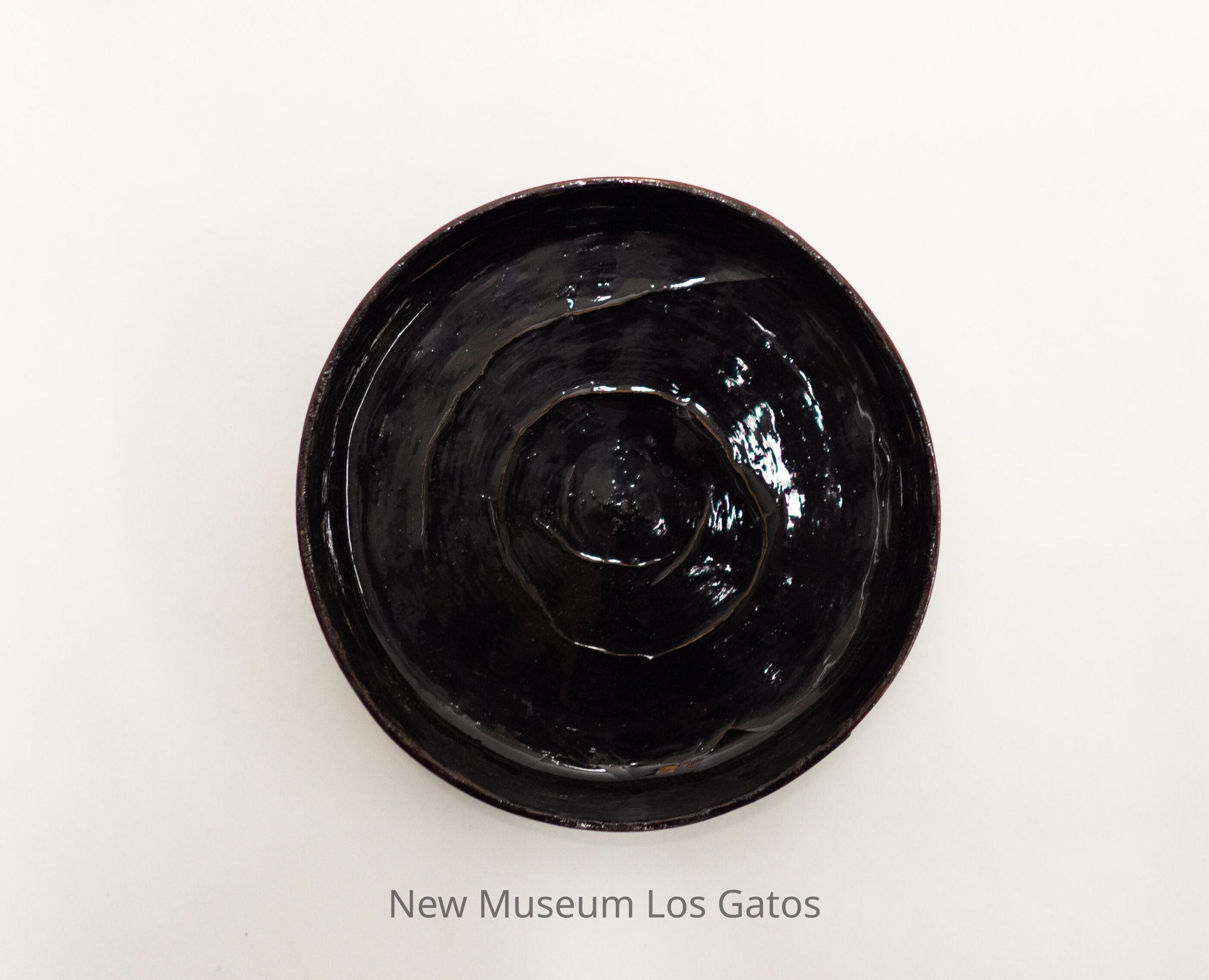 A shallow, circular bowl, covered in plain black lacquer. There is a little bit of a lip around the outer rim.Collection