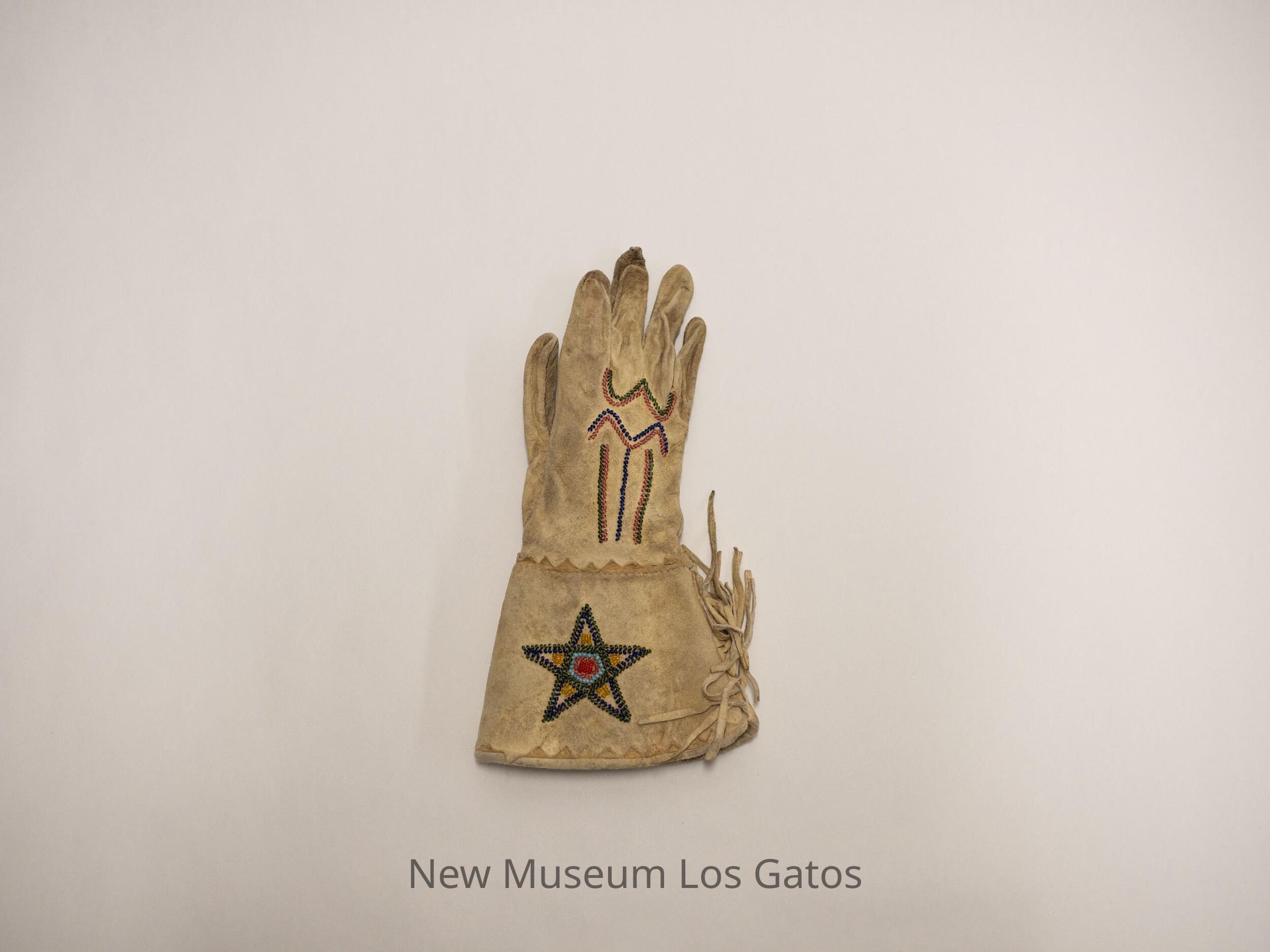 Right leather glove, with fringe on the right side of the cuff. There is beaded detailing on the cuff and on the top of the hand.