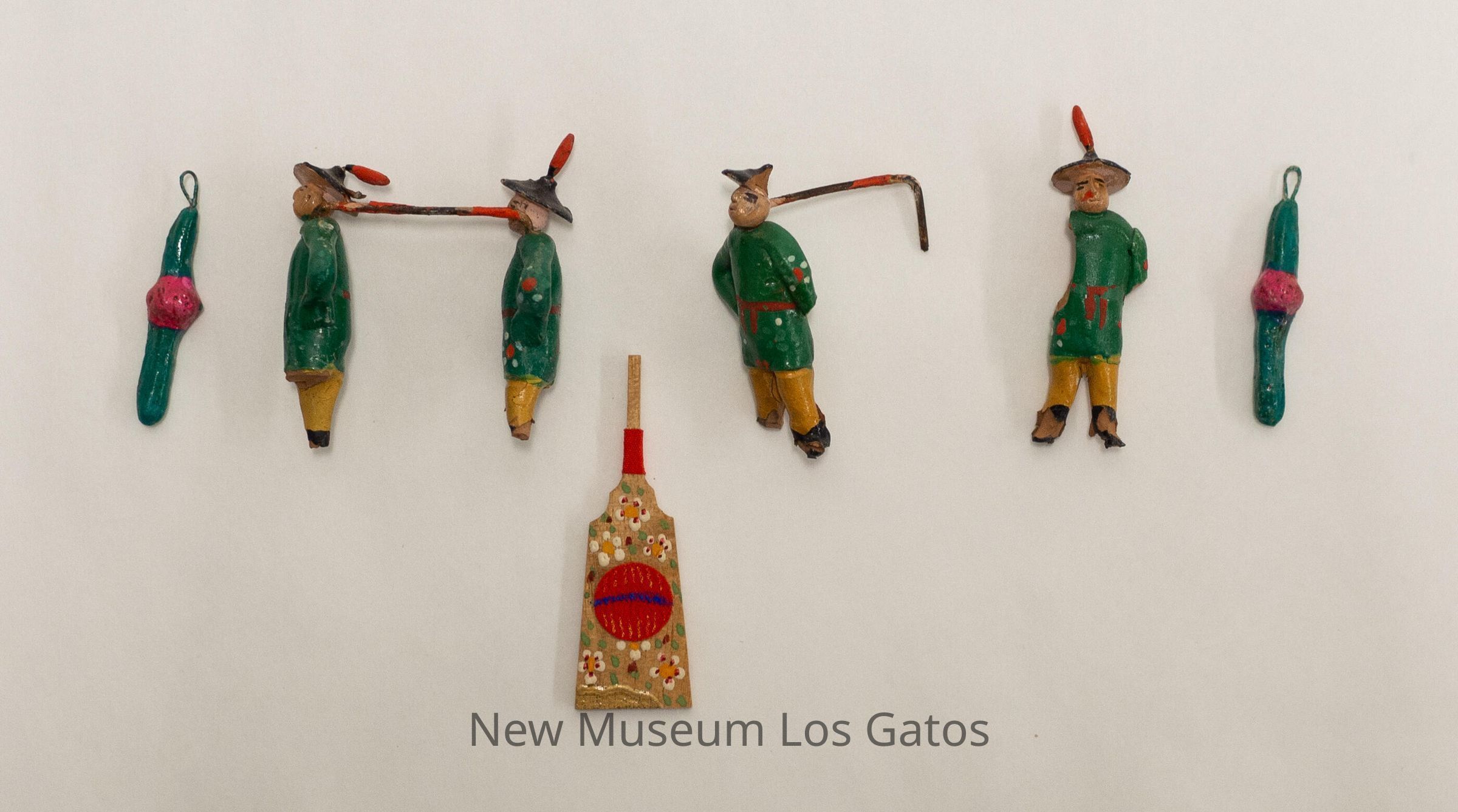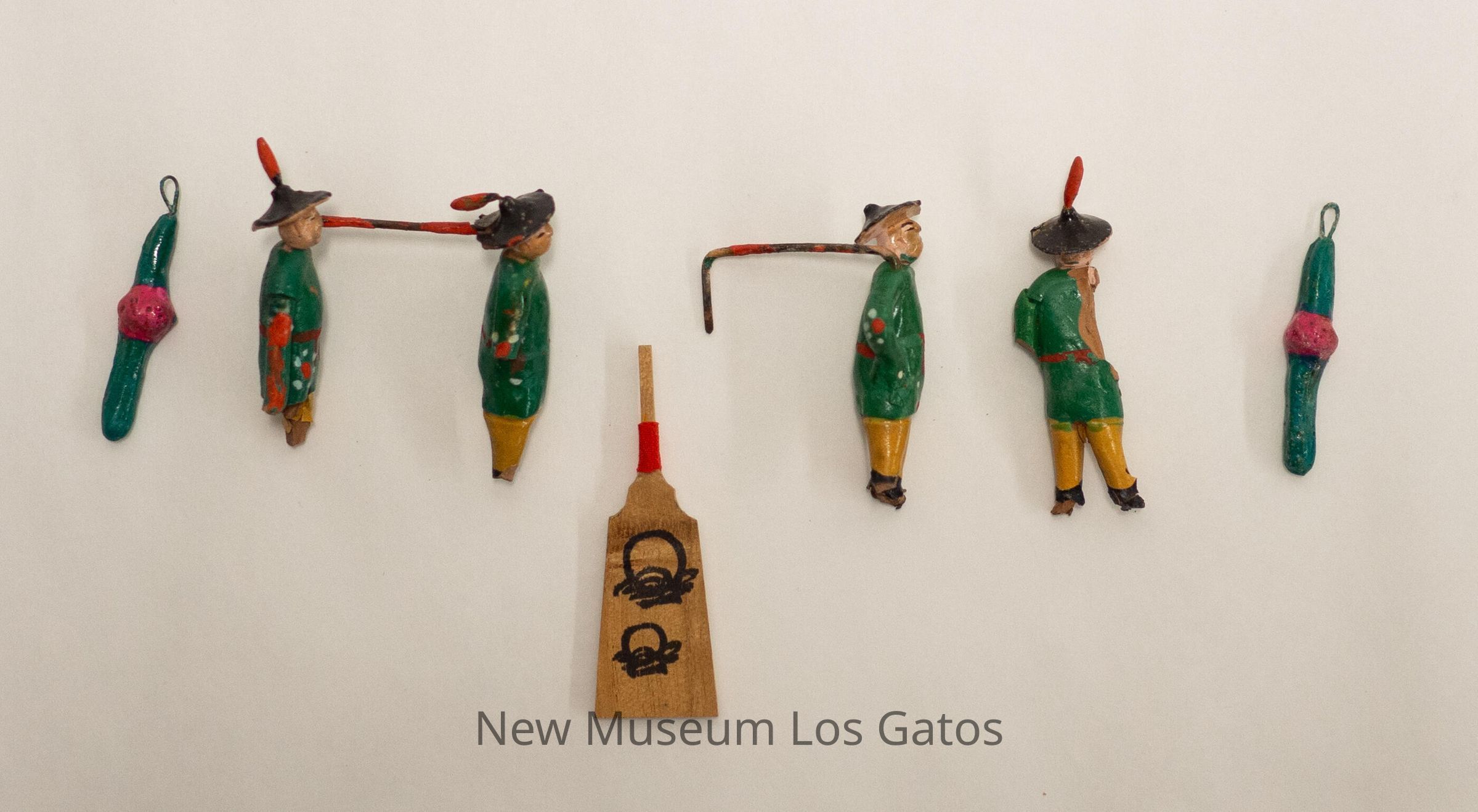 A set of small, painted wooden miniature figurines. Two sets consist of two connected people wearing black shoes, yellow pants, green tops, and black hats. There are two skinny green pieces with pink in the center, and small metal hoops on one side. There is also a wooden paddle with floral decorations and a red circle in the center, and assorted fragments.Collection