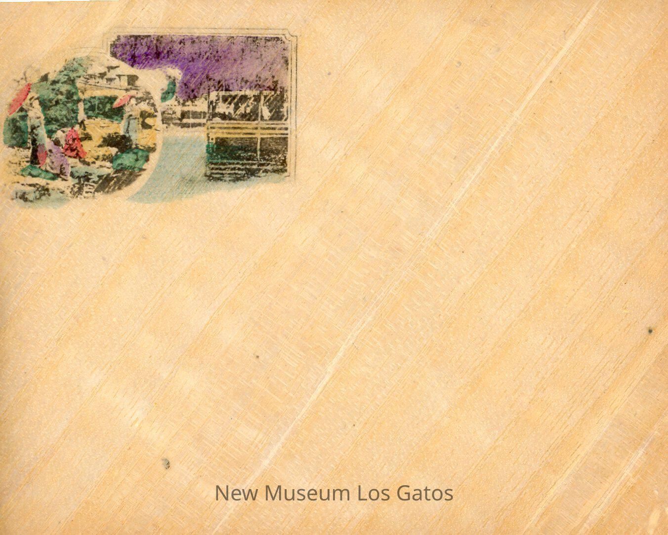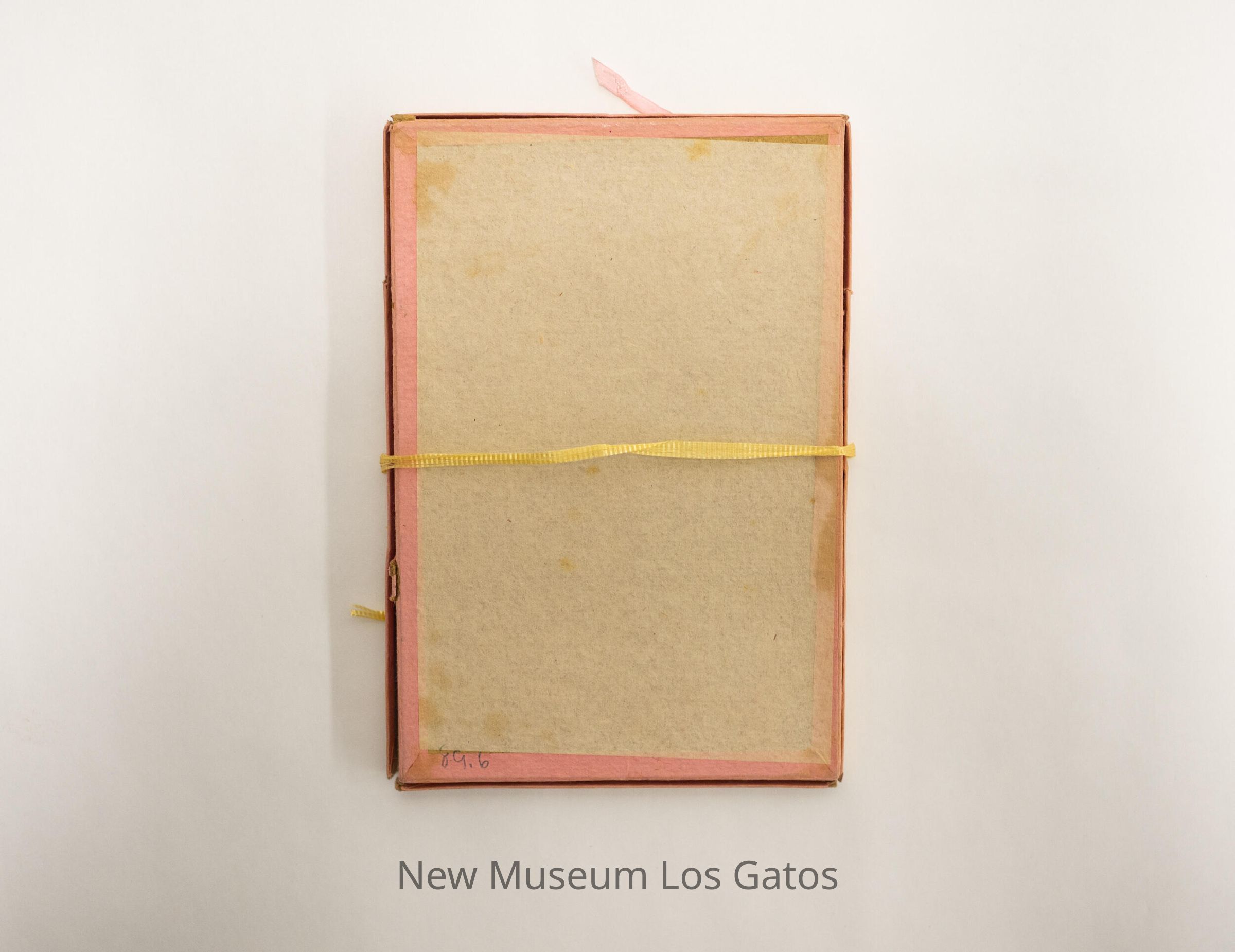 A rectangular stationery box filled with cards and small envelopes. The box is white with pink edges, and a small label and pink ribbon bow at the top. The cards open horizontally to the left, and have what appear to be photorealistic paintings depicting various scenes from Japanese life. The envelopes are small, and also depict photorealistic paintings of various scenes from Japanese life in the upper left corners. There is also a yellow ribbon tied around the box.Collection