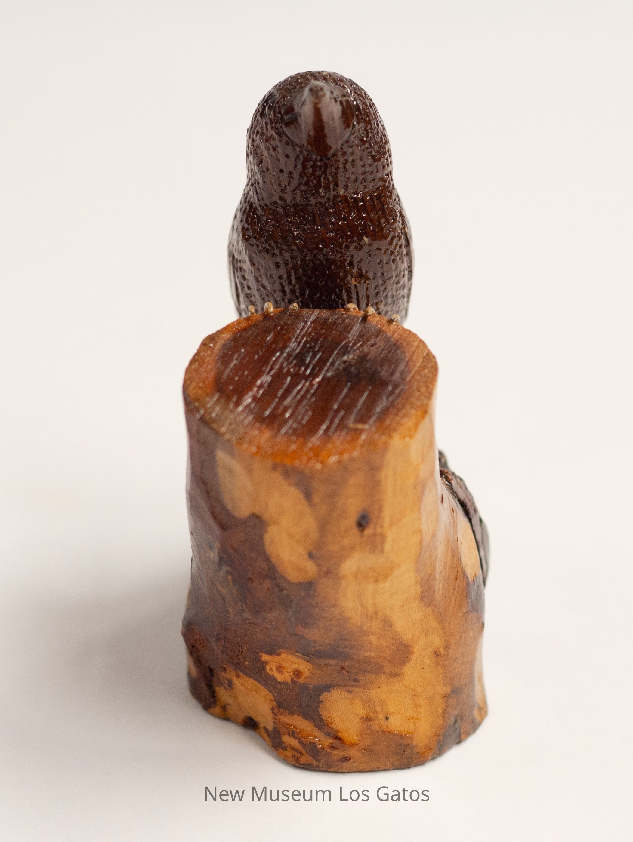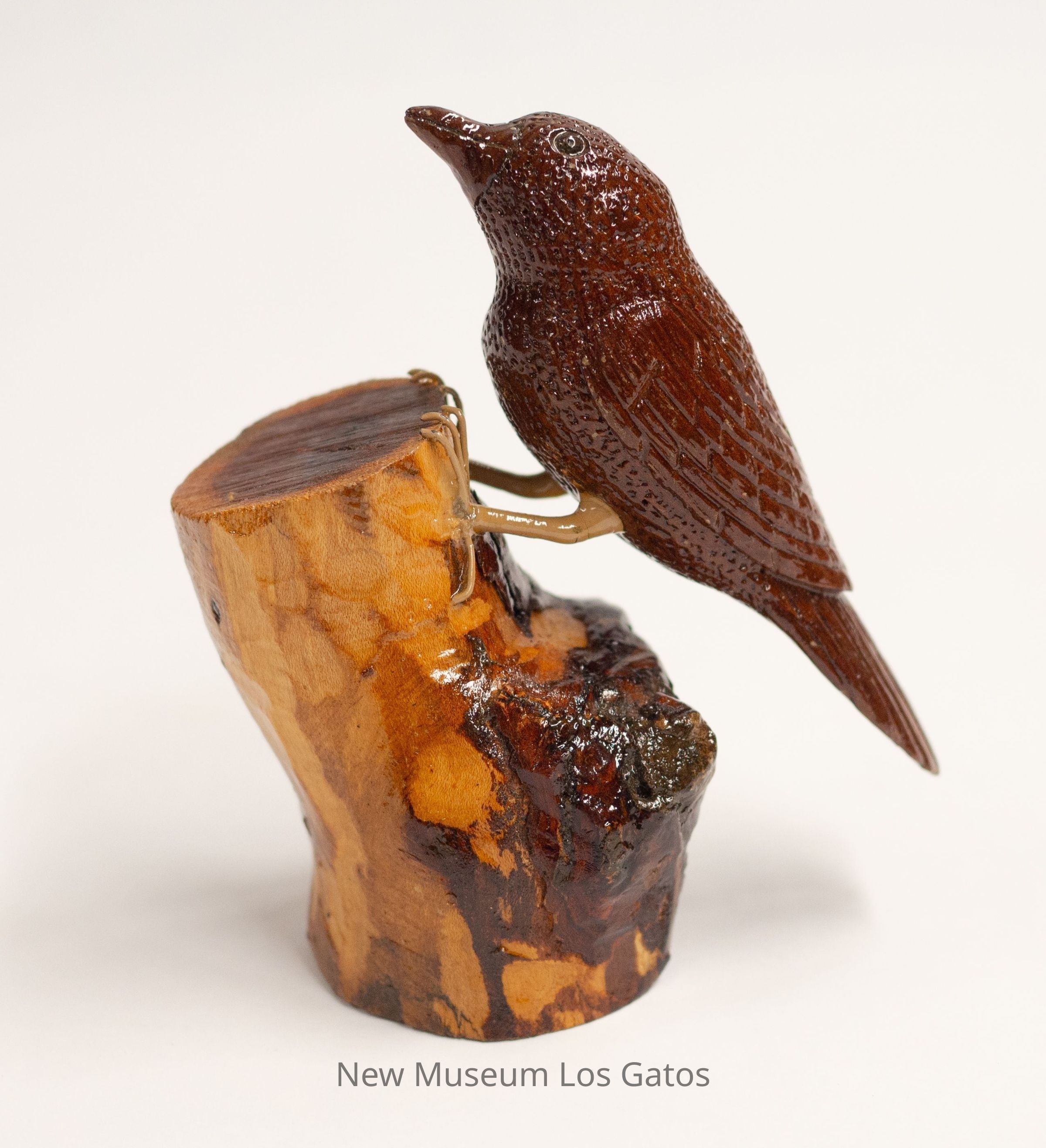 A dark reddish brown hand-carved wooden sculpture of a bird. The bird is perched on a stump that is mottled brown. The bird is looking up with beak closed.Type of Sculpture