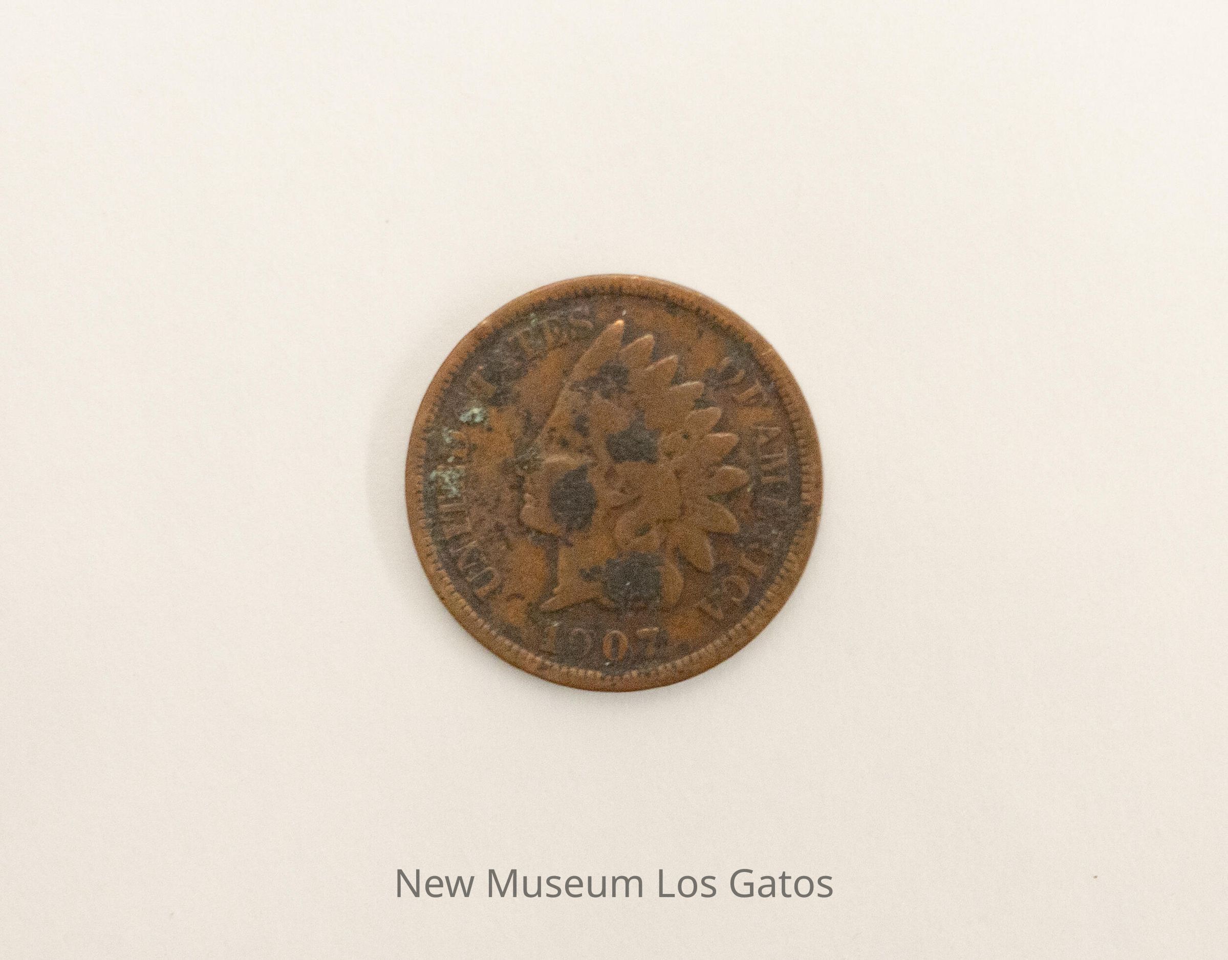 A 1907 United States penny, colloquially called an "Indian Head Penny." The obverse side of the coin features Lady Liberty wearing a headdress, while the reverse side features the words 'one cent' inside of an oak wreath and underneath a shield.Collection