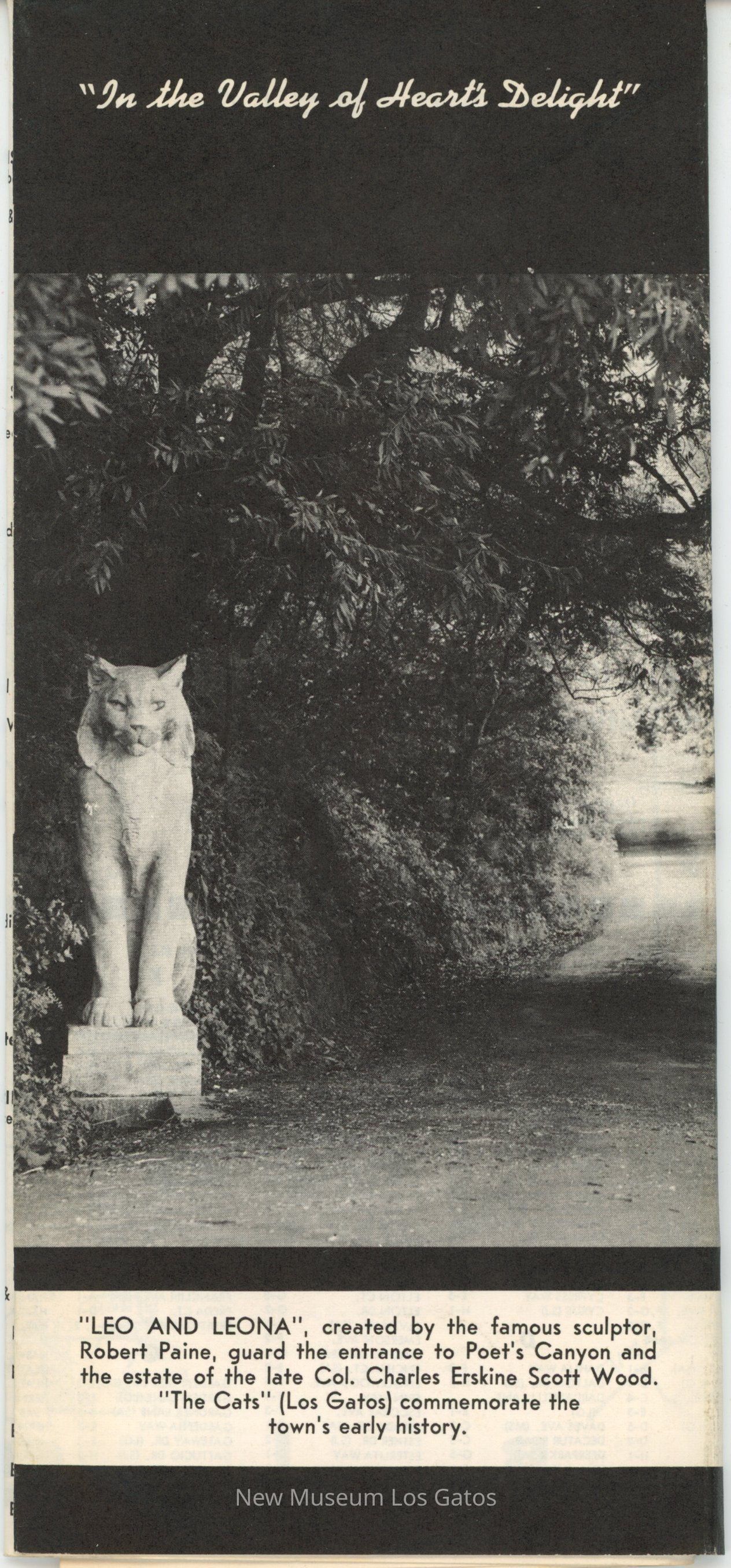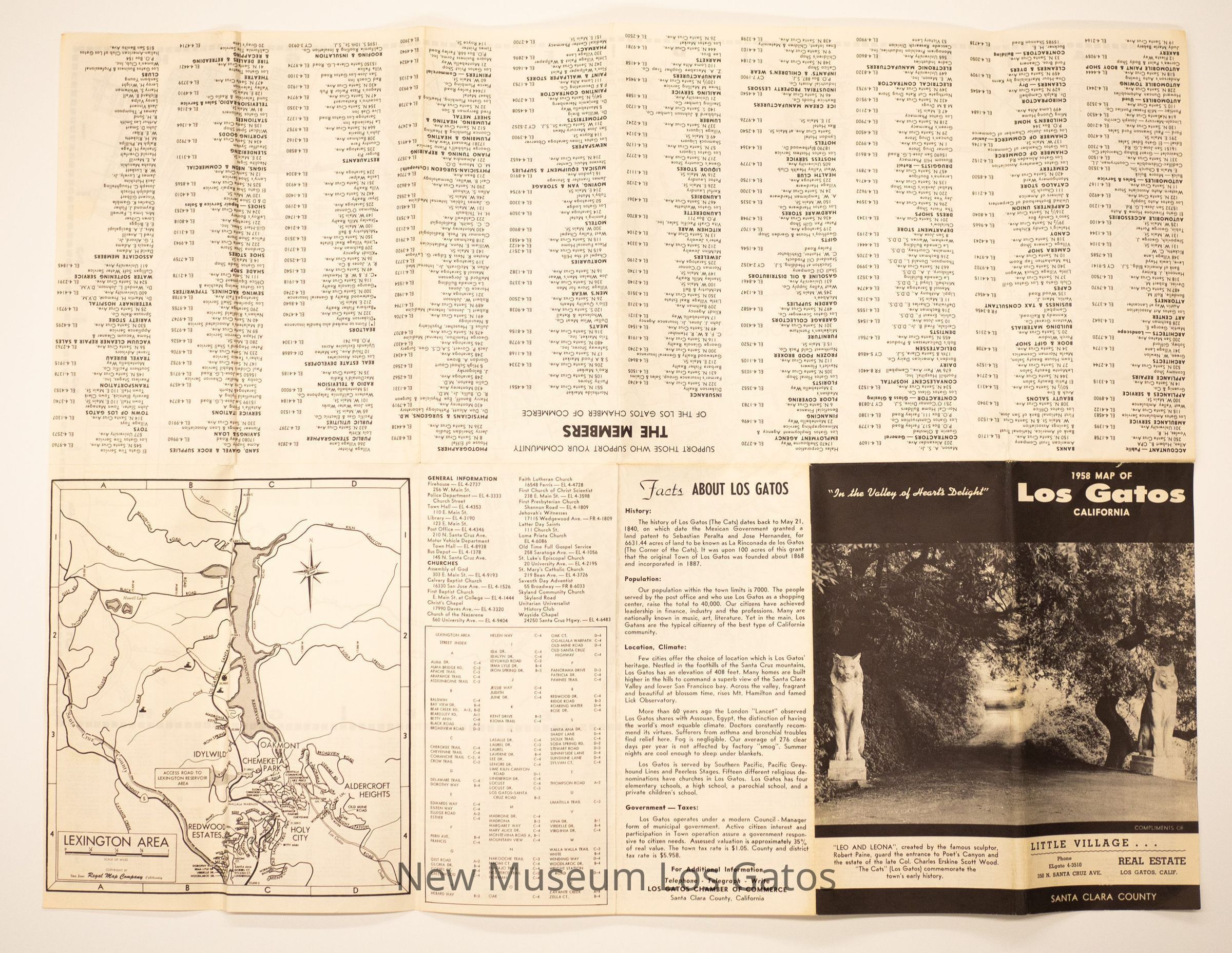 A black and white fold-out map of Los Gatos, including a list of members of the Chamber of Commerce, short facts about Los Gatos, and local advertisements.Collection