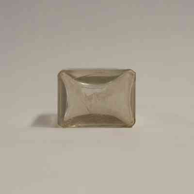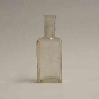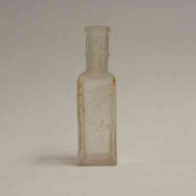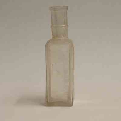 A clear, rectangular glass bottle. Identifying information is embossed on one of the wider sides. The neck is long, and has a raised band about halfway through.Collection