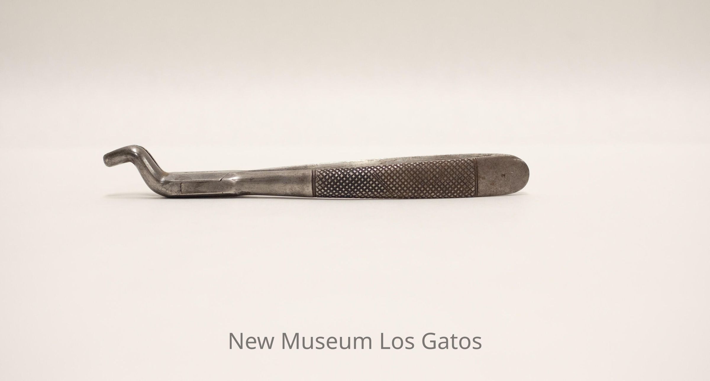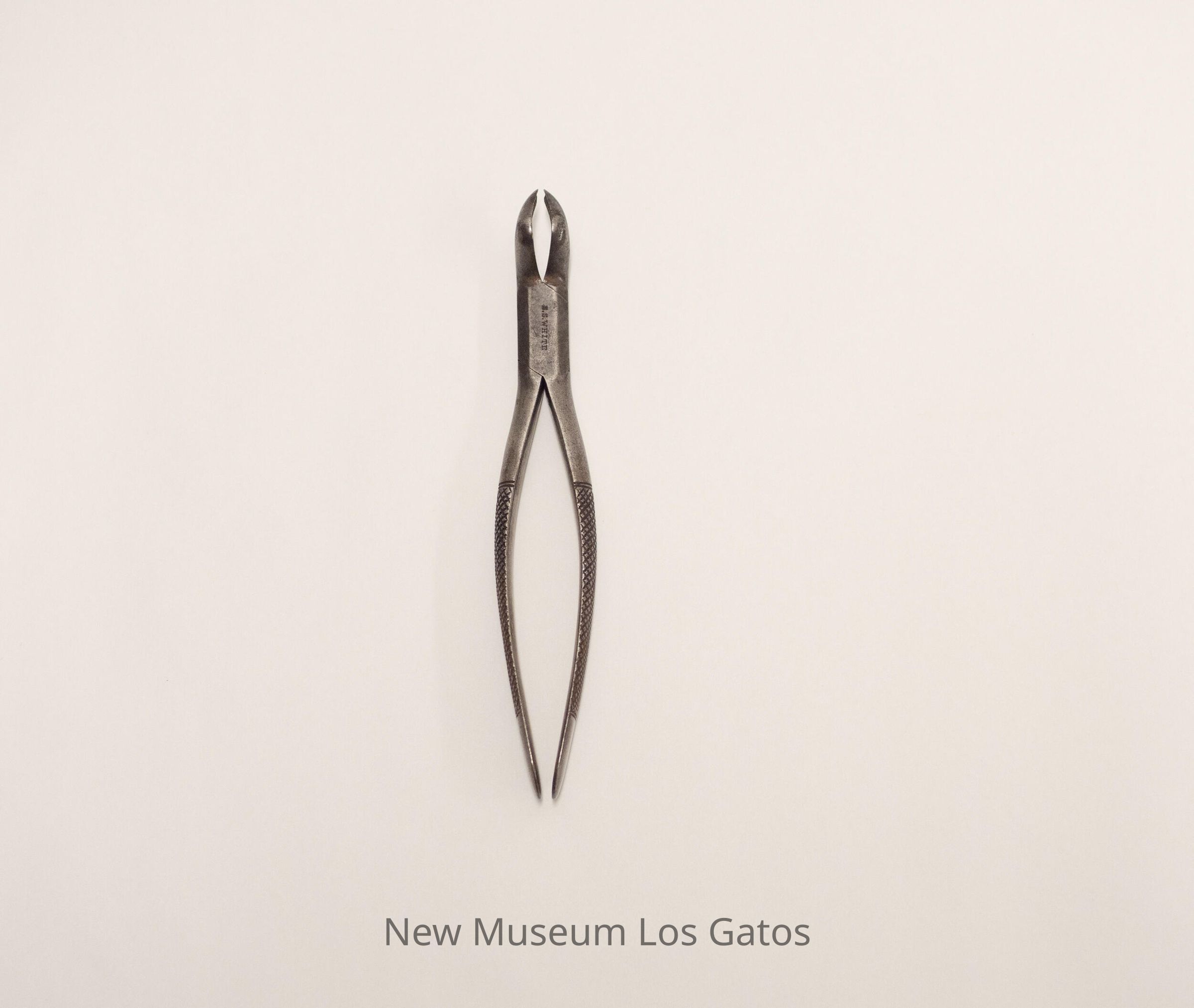 Pair of dental forceps with curved pincers and textured cross-hatching on the handles.