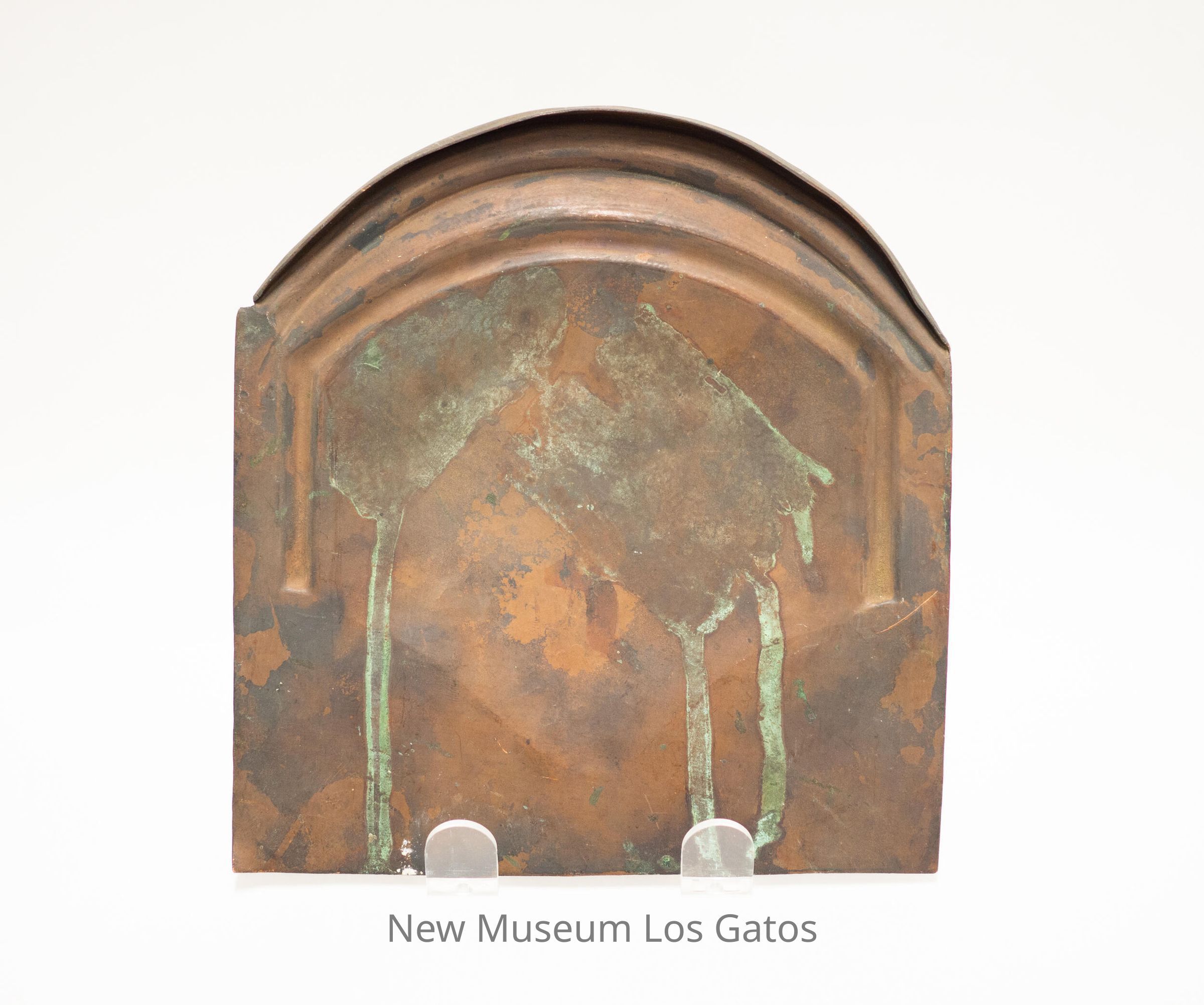 A mostly square thin copper piece with a rounded top. The rounded side angles up, with two grooves in the copper. The center of the piece is bumped out slightly.