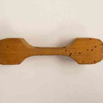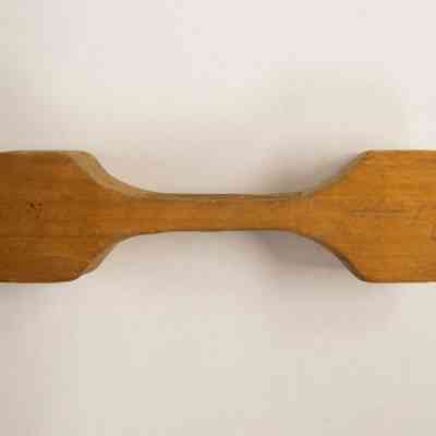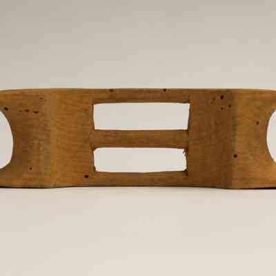 A small, unidentified wooden object. The object has curves carved out of each end, with three connector sticks inbetween.Collection