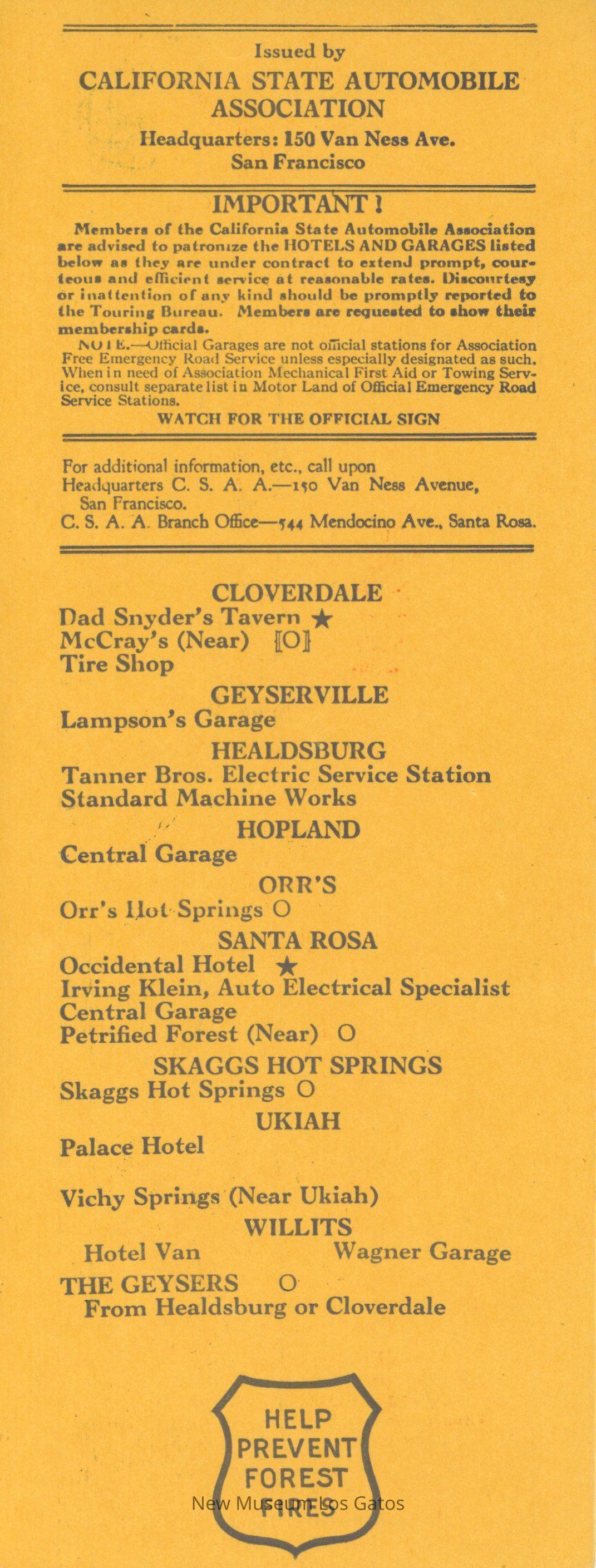 A small, single-sheeted cardstock map, depicting the highways and roads, both paved and unpaved, that go from Willits to Garberville. There is also information about approved service stations and hotels in that area.Collection