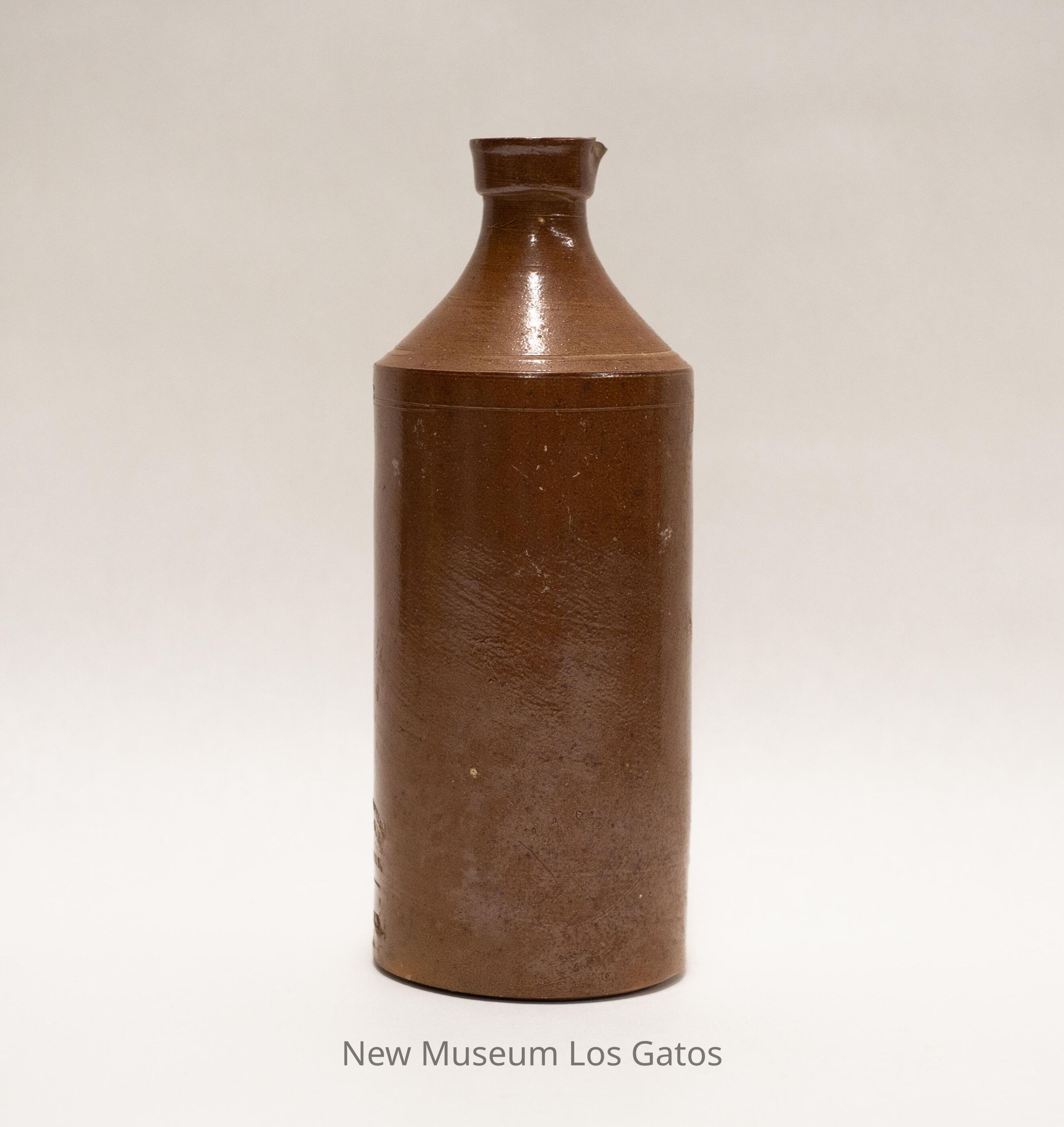 A large, brown cylindrical stoneware bottle. There is a pour spout at the rim.