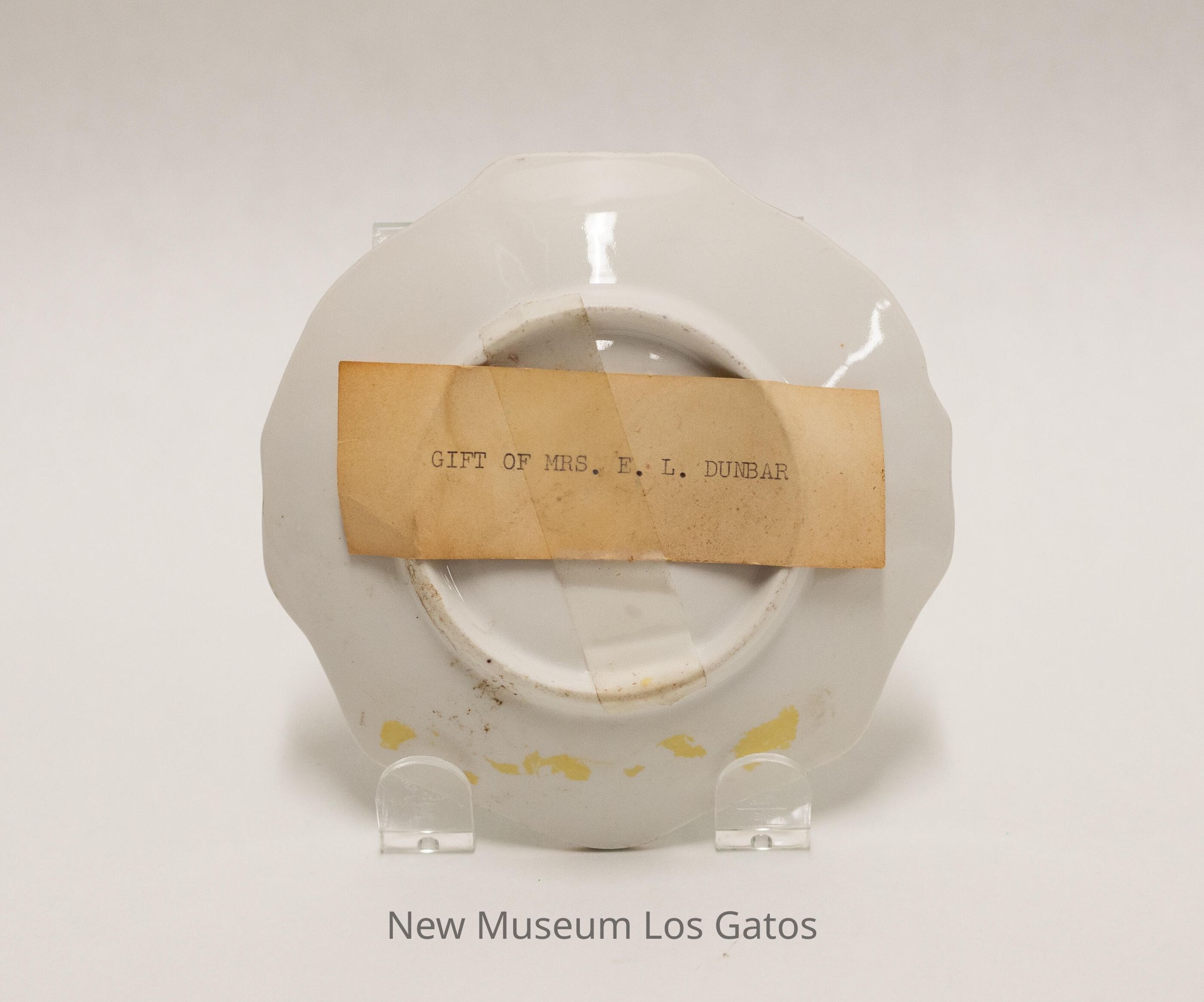 A small white and blue commemorative plate, with a colorful illustration in the center. The blue color is in four spots around the rim of the plate. There is also raised decorative ridges along the rim of the plate, with gold paint highlighting the ridges. The illustration depicts Forbes Mill, with an inscribed banner underneath.Collection