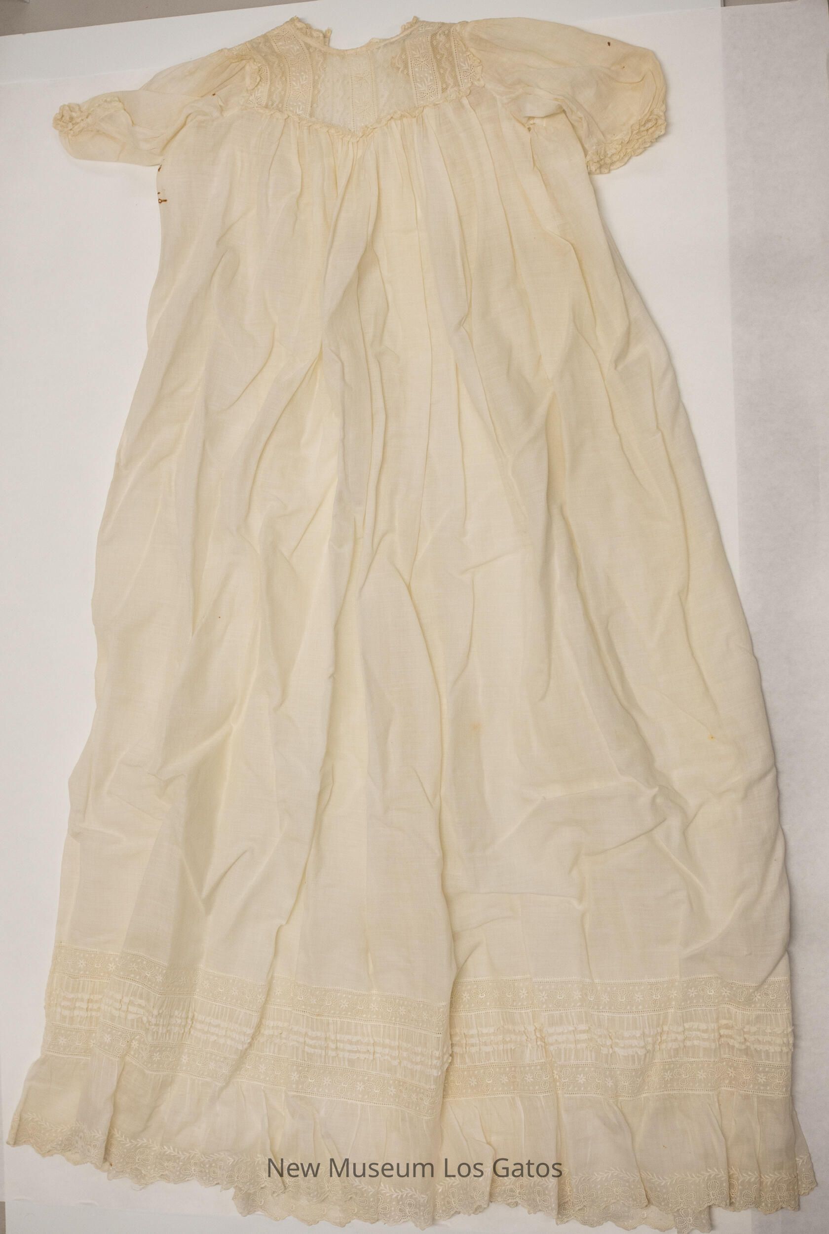 A small, white, long linen dress. There is an embroidered leaf and eyelet bow decorative pattern along the hem of the dress, as well as in two horizontal bands towards the bottom of the skirt. In between those two bands are three small horizontal ruffles. The chest area consists of sheer lace with vertical stripes of the embroidered leaf and eyelet bow pattern. The dress opens in the back, and closes with three small white, iridescent buttons.Collection