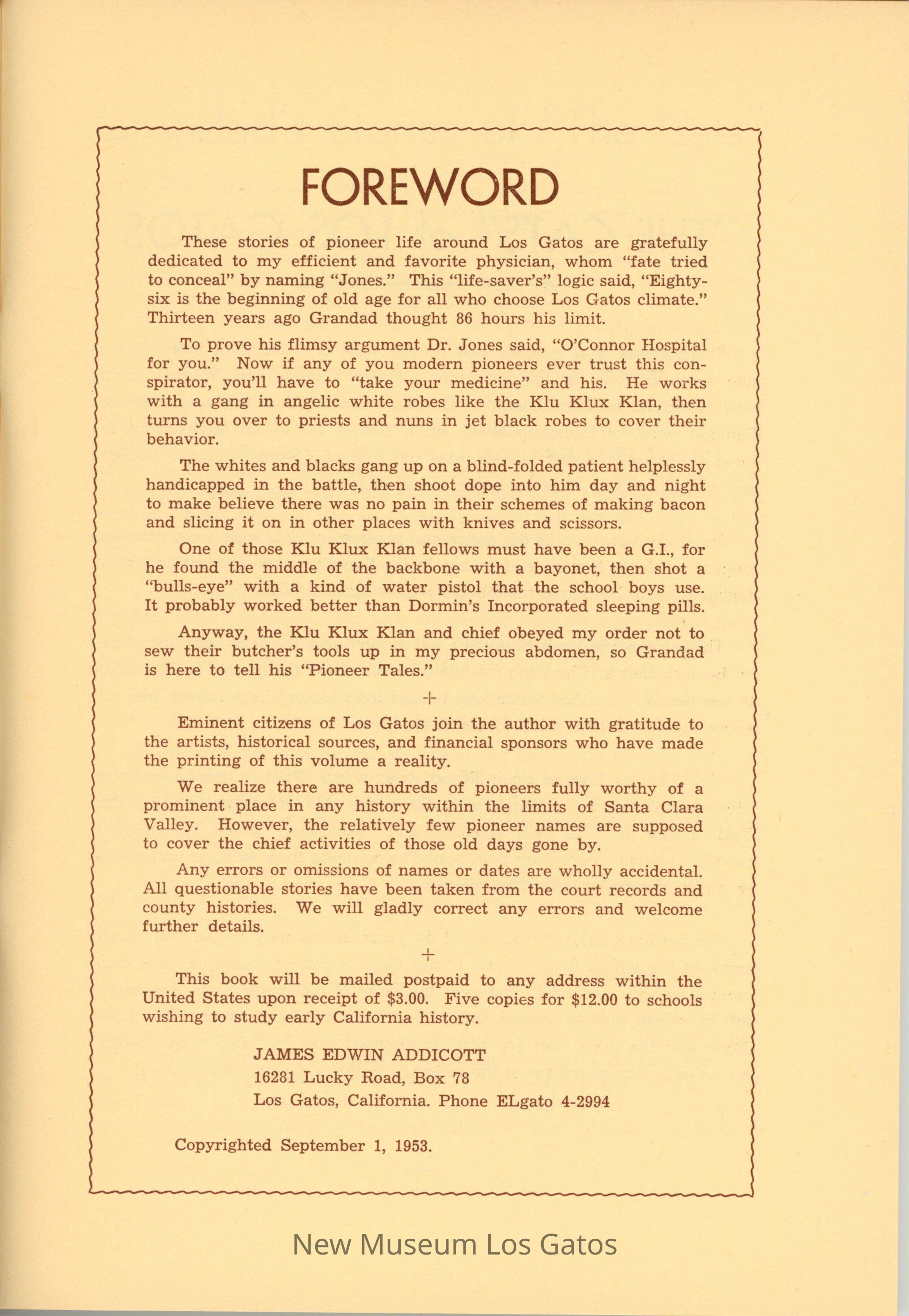 A booklet featuring a collection of short stories about the pioneers and settlers of the Los Gatos area.