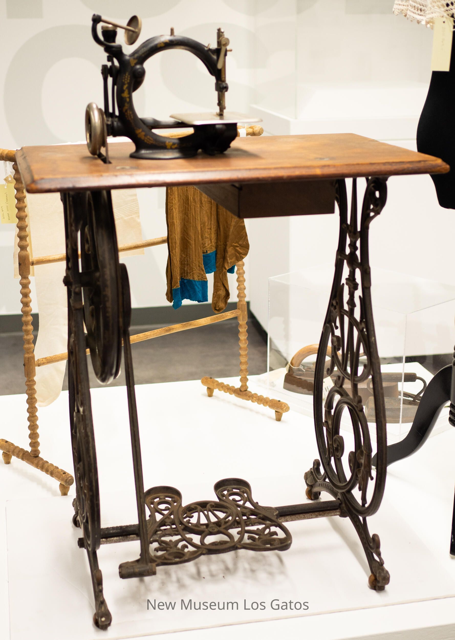 A large, foot pedal operated sewing machine. The base and sides are cast iron, and have a floral, decorative pattern that also includes the "WG" initials of the manufacturer. The top of the sewing machine is a rectangular wooden table, and attached to the right side of the table is the sewing mechanism itself. The arm and bed is metal that is painted black with golden leaves and grapes decorating the sides, as well as the manufacturer's name painted in gold. The needle, needle clamp, throat plate, and balance wheel are a silver metal. There is a small wooden drawer attached to the bottom of the table that slides out, and inside the drawer are genuine Willcox and Gibbs sewing needles and parts.Collection
