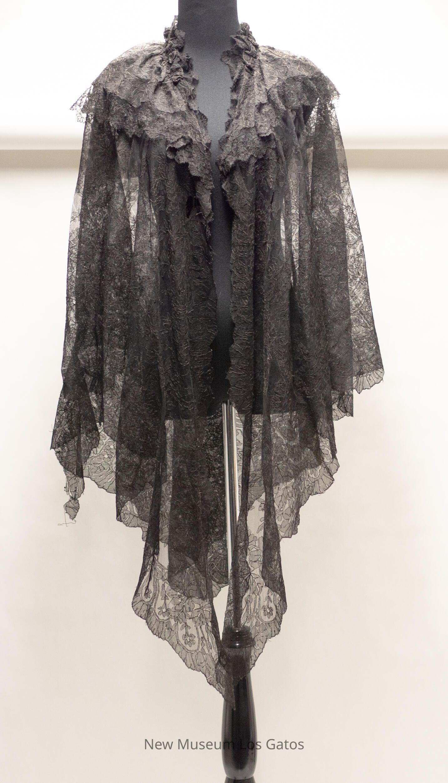 A large, black lace cape. The lace has a floral print. There is an opaque, black fabric backing along the interior upper section of the cape. There are also two small, extra layers of lace along the exterior upper back of the cape.Collection