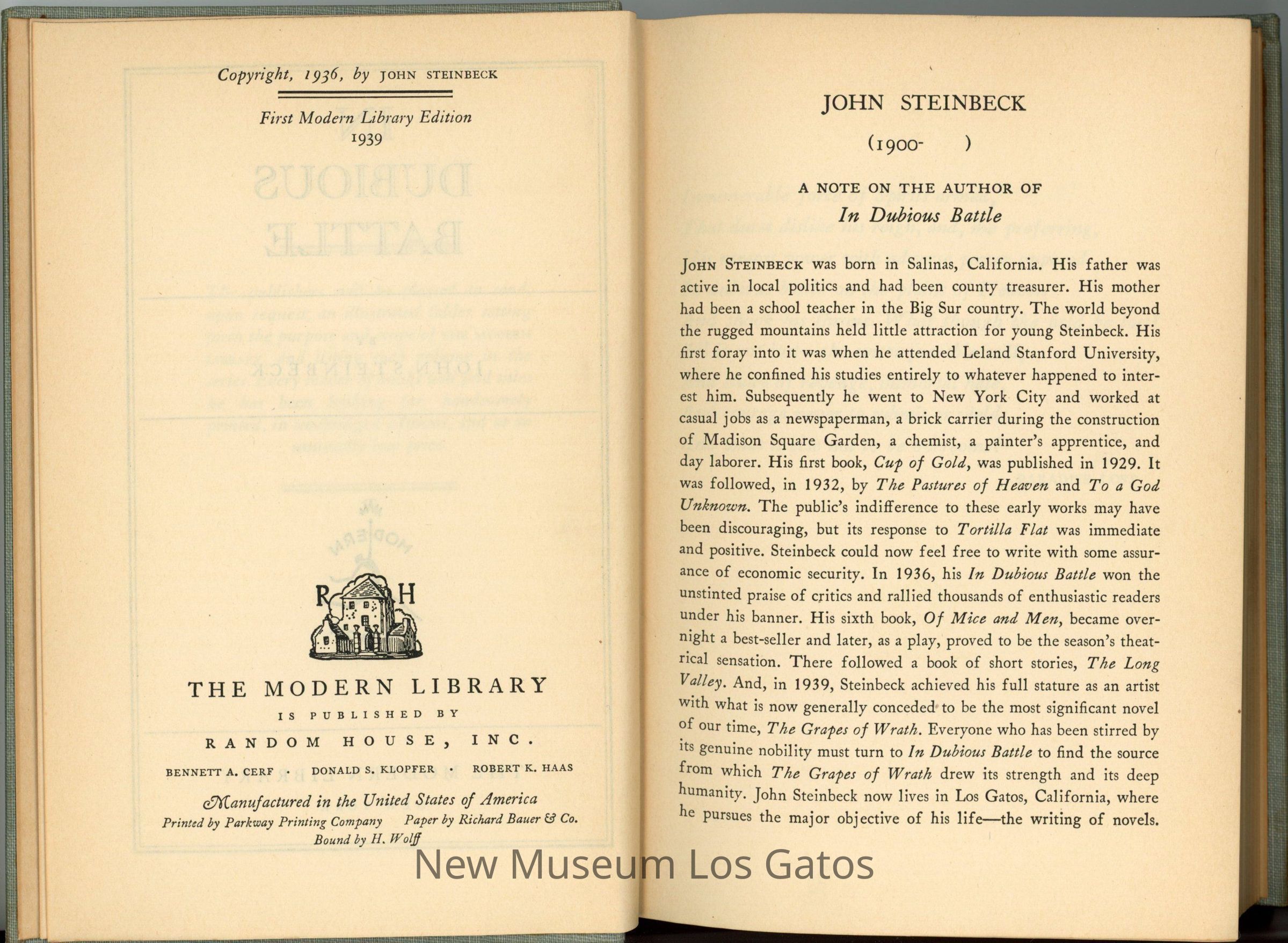 A gray, fabric-bound book with a decorative gold figure the front cover. This work of fiction tells the story of an activist attempting to unionize fruit laborers.Collection