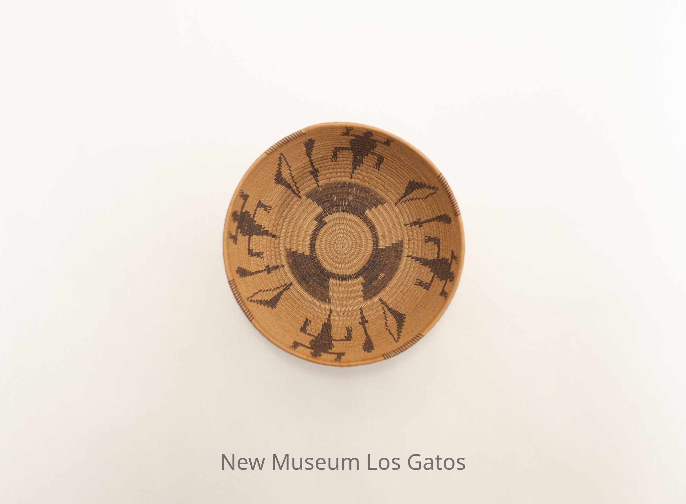 A small, tan basket with a brown lizard-arrow-bow pattern that repeats five times around the basket.Collection