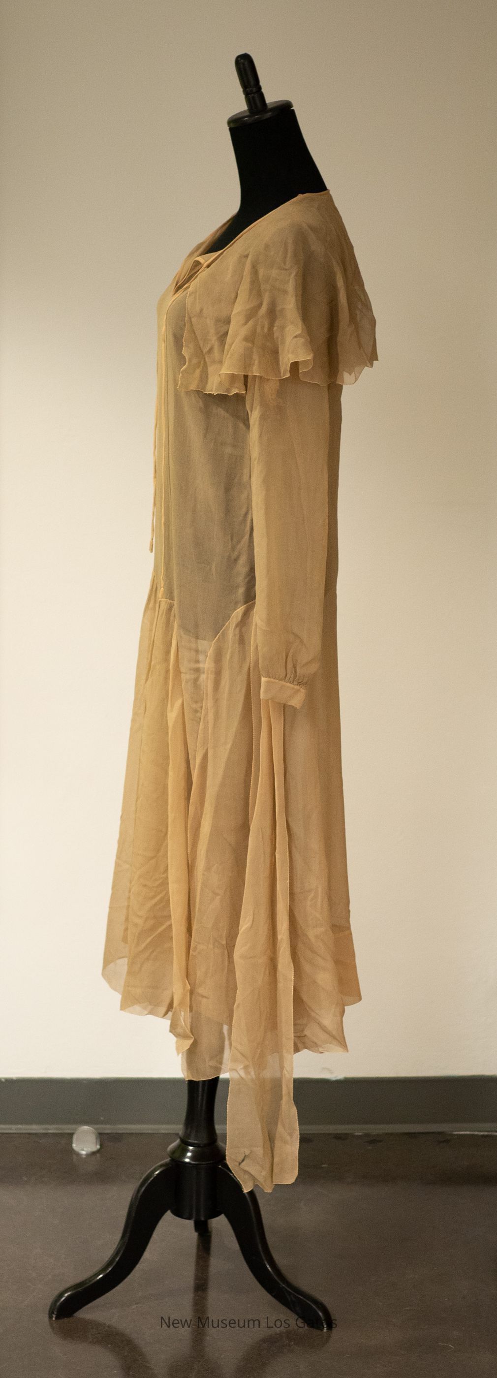 A long-sleeved, brown georgette day dress. The bottom section of skirt has numerous strips of fabric (godets) that branch off from the main skirt. There are ties around the center of the dress, and ties at the neckline as well. There is an exaggerated collar. The sleeves fasten at the cuffs.Collection