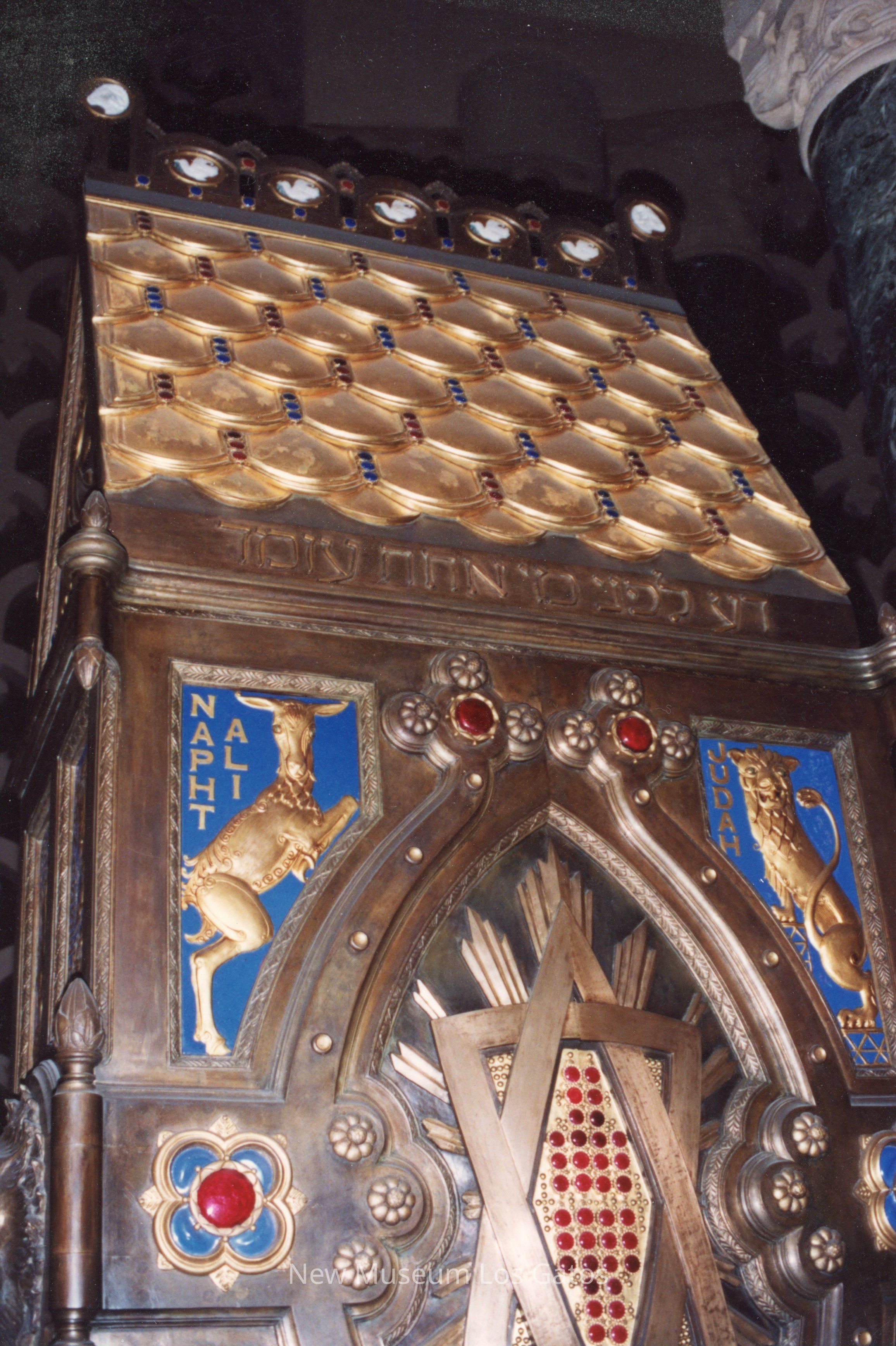 A color photograph featuring a partial view of the Ark of the Covenant. The top half of the side with the doors is visible, as is the roof, which features a scalloped panel pattern and blue and red jewels.