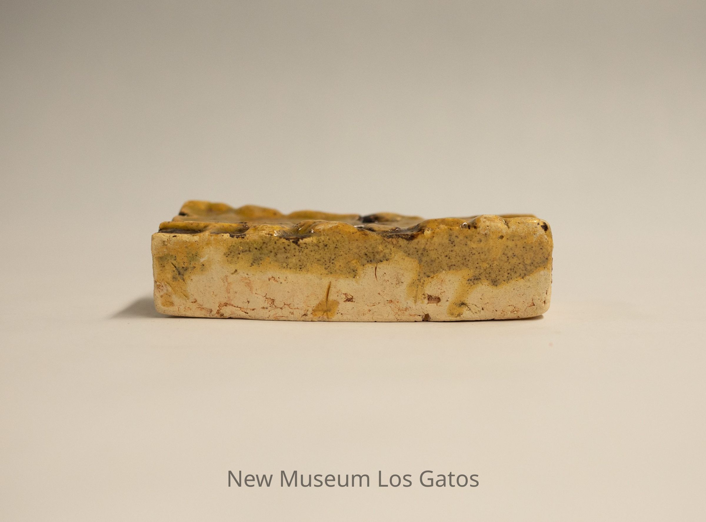 This tile came into my possession with raw glaze, that is, the tile had glaze applied but then was left unfinished ― without being given a (second) glaze (or glost) firing. Only the clay had gone through the fire. In 2005, as an experiment, I had the academic potter here at U. of Illinois, Don Pilcher, fire it and what you see are the results.