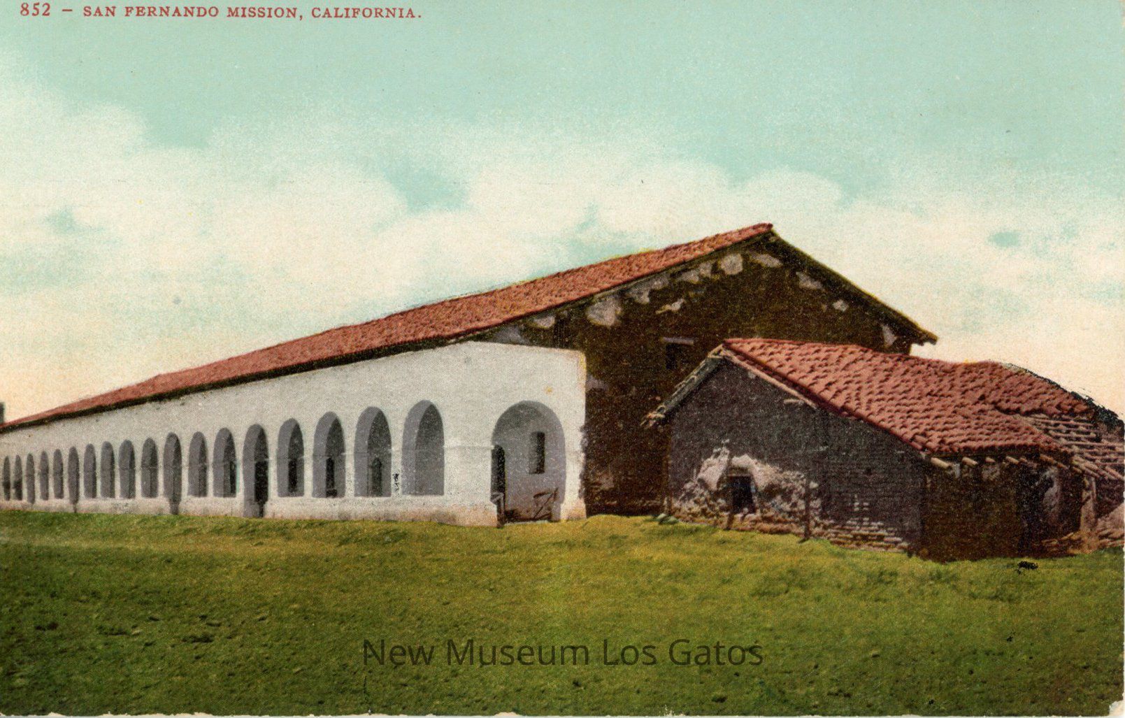A colorized postcard featuring the San Fernando Mission. The postcard is unused.Subject Place