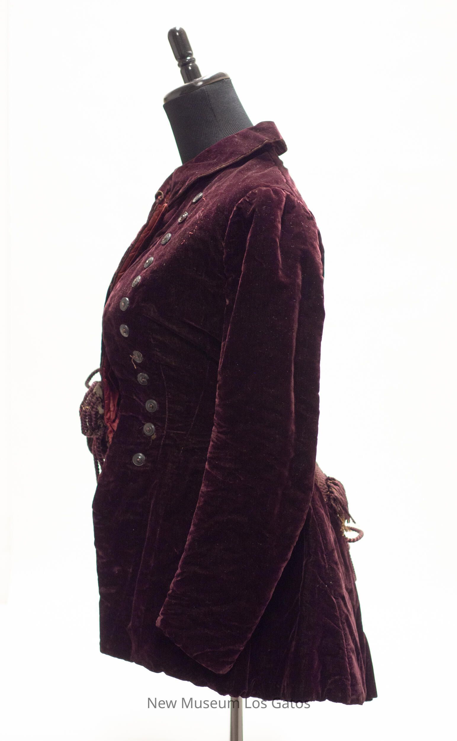 A velvet, burgundy bodice. The bodice opens in the front, and closes slightly off-center to the left with large black buttons. There is decorative burgundy cording twined into circles, two on each side at the waist and the chest, that attach to each other with three cords; there is also cording twined into two circles and attached with three corded ropes at the lower back. The interior of the bodice is a lighter burgundy/maroon, and is quilted.Collection