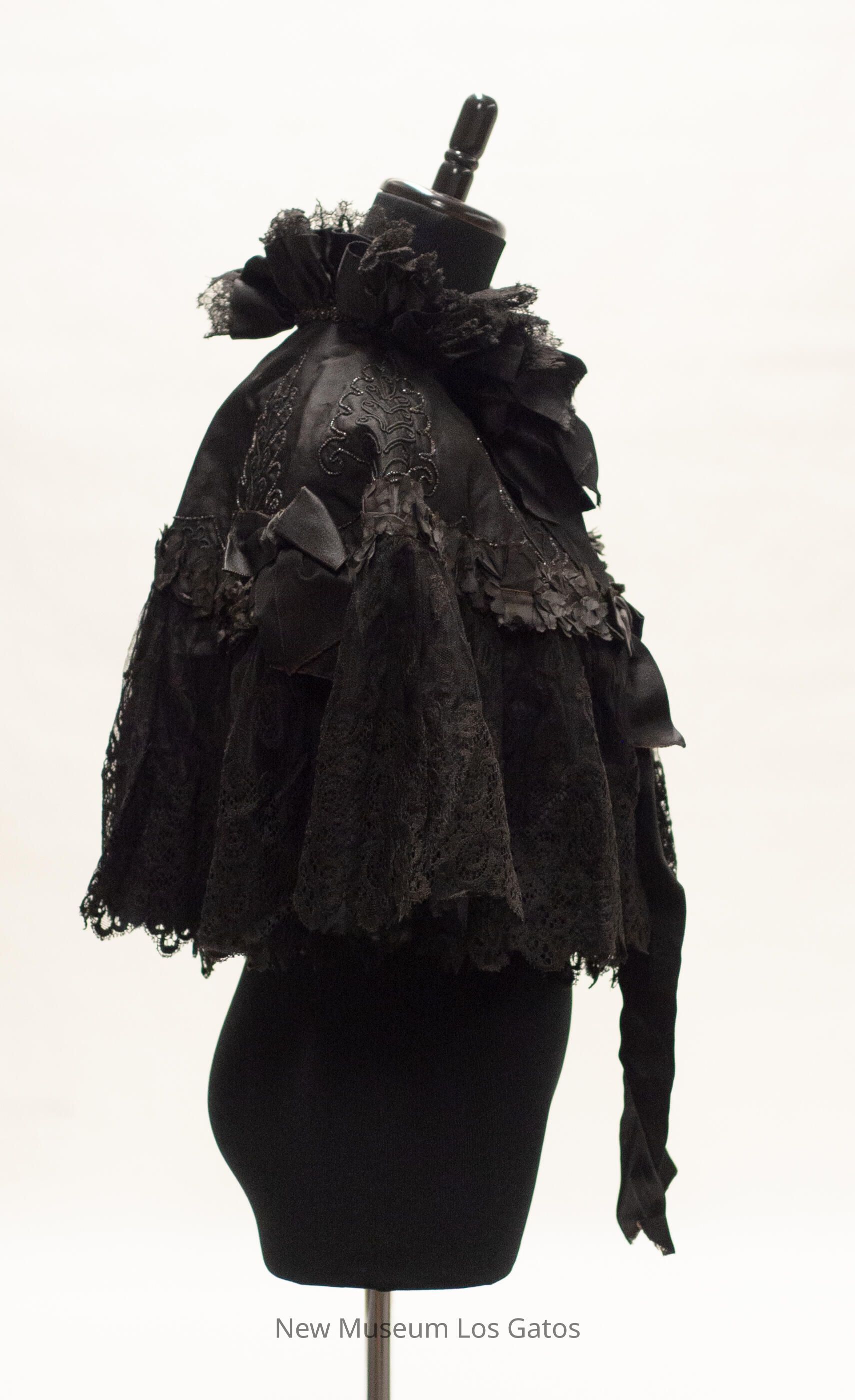 A black, satin cape. There is a line of black ruffles running horizontally through the middle of the cape, with three black bows. Below the ruffles is a layer of black lace, and above the ruffles is a decorative beaded pattern in the shape of leaves. The cape secures at the neck with two hook-and-eye clasps; there is also a black ribbon bow at the neck. The interior of the cape is plain black satin.Collection