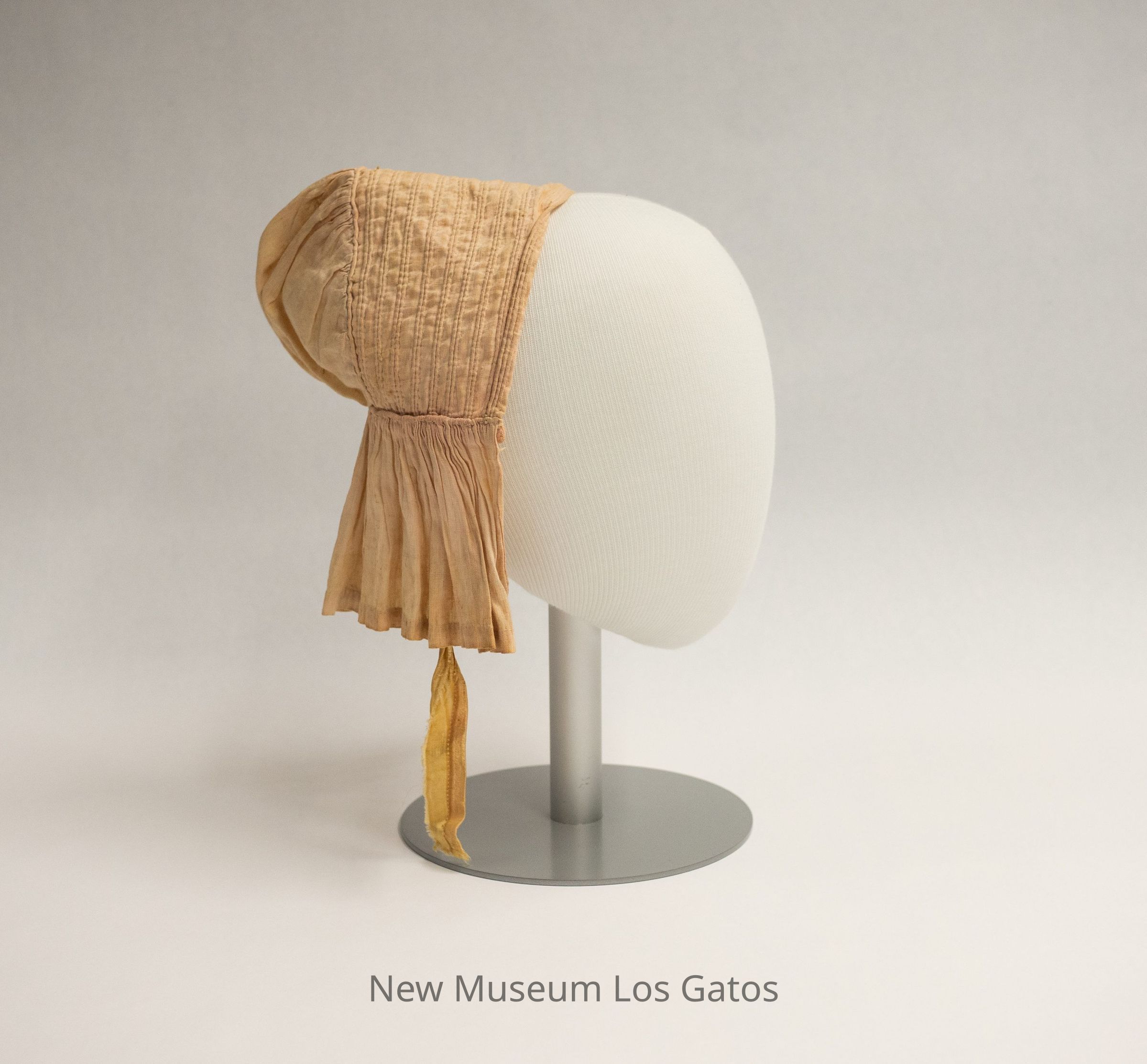 Baby bonnet, made by Mrs. Norman O'Connor's grandmother for twins born August 12, 1856, in Hangtown (now Placerville) California. The twins were the first to be born in Northern California, as far as known. One twin was John Henry, the other was Sara Ellen (Clinkinbeard), Mrs. Norman O'Connor's mother.Language