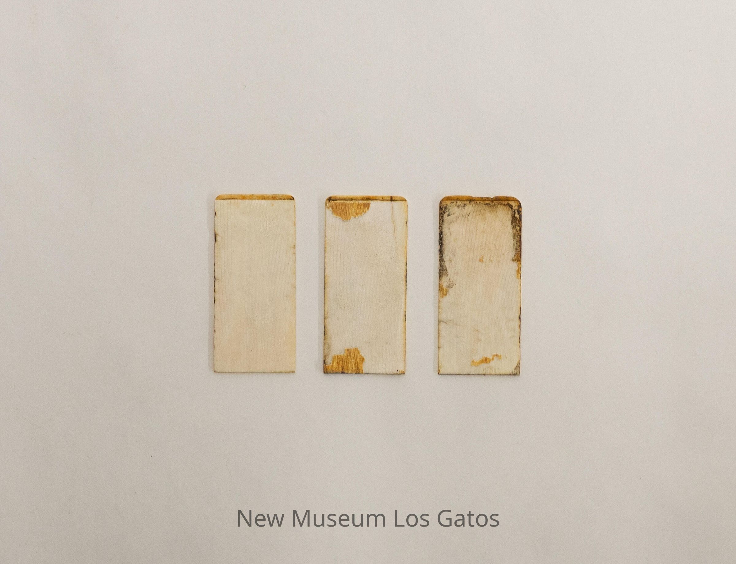 Three white, slightly iridescent piano keytops. Each keytop is rectangular, with rounded corners on one side and straight corners on the other side.