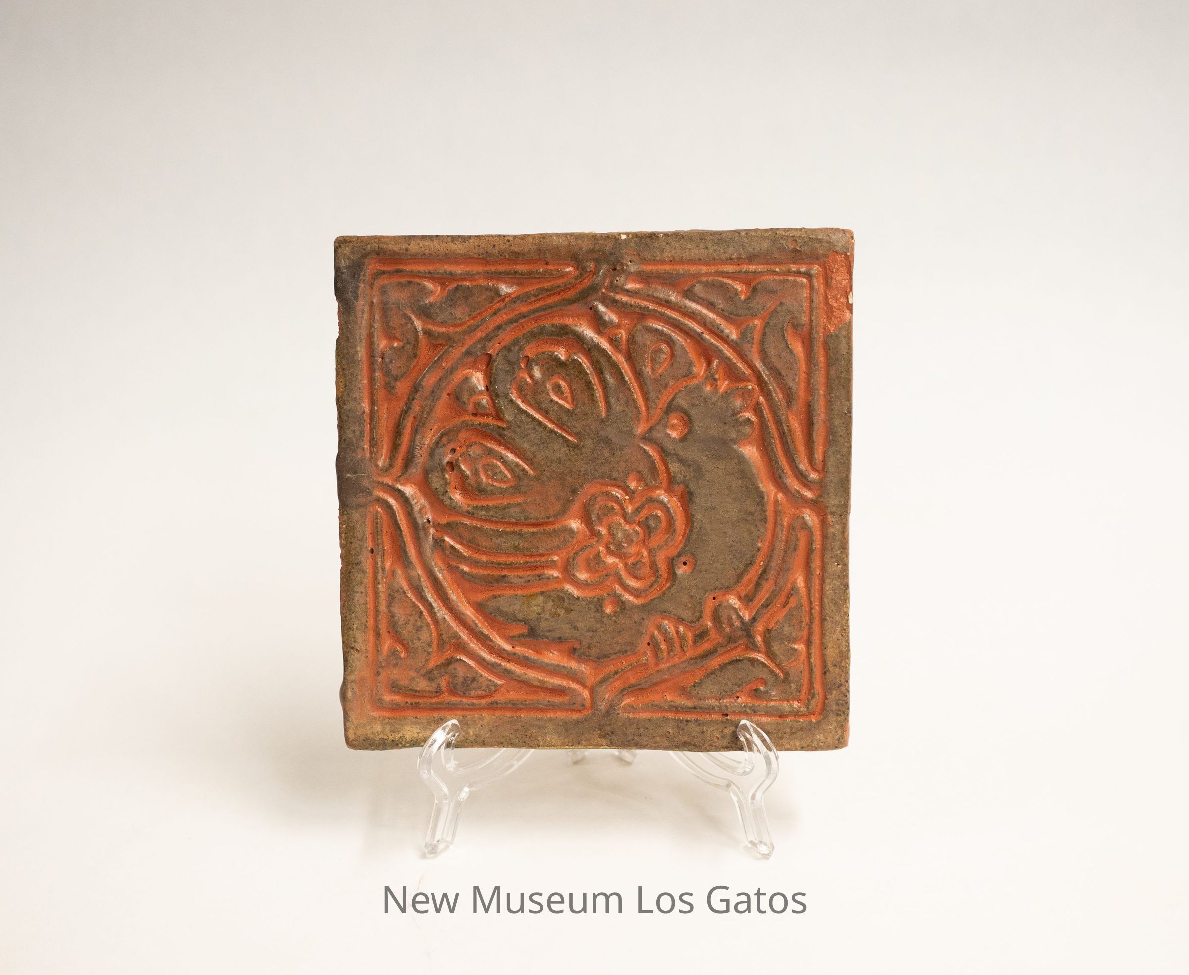 A square, decorative tile. The tile itself is tan in color, and features a Batchelder-inspired bird design on its face. The design consists of grooves that form a bird, looking backwards, in the center with geometric designs around it. The grooves are colored and glazed red, with the negative space glazed brown.Collection
