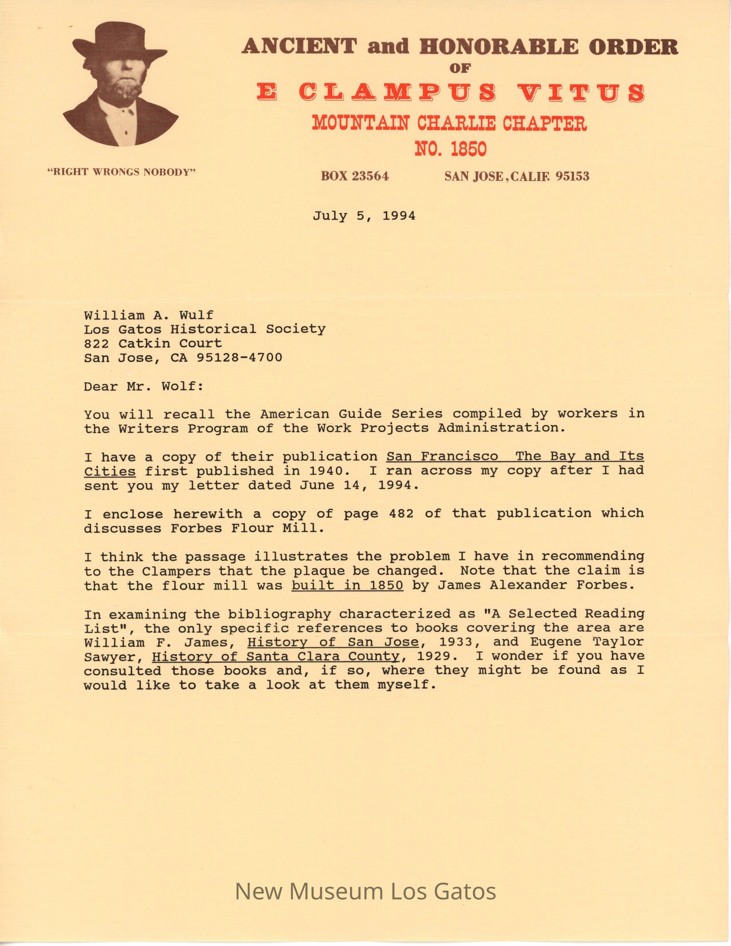 A typed, two page letter on E Clampus Vitus letterhead regarding further research into the date Forbes Mill was built, and the plaque dispute. Enclosed with the letter are two photocopied pages from the book "San Francisco, The Bay, and Its Cities" that support Pete Tiernan's points.Subject Person/Organization