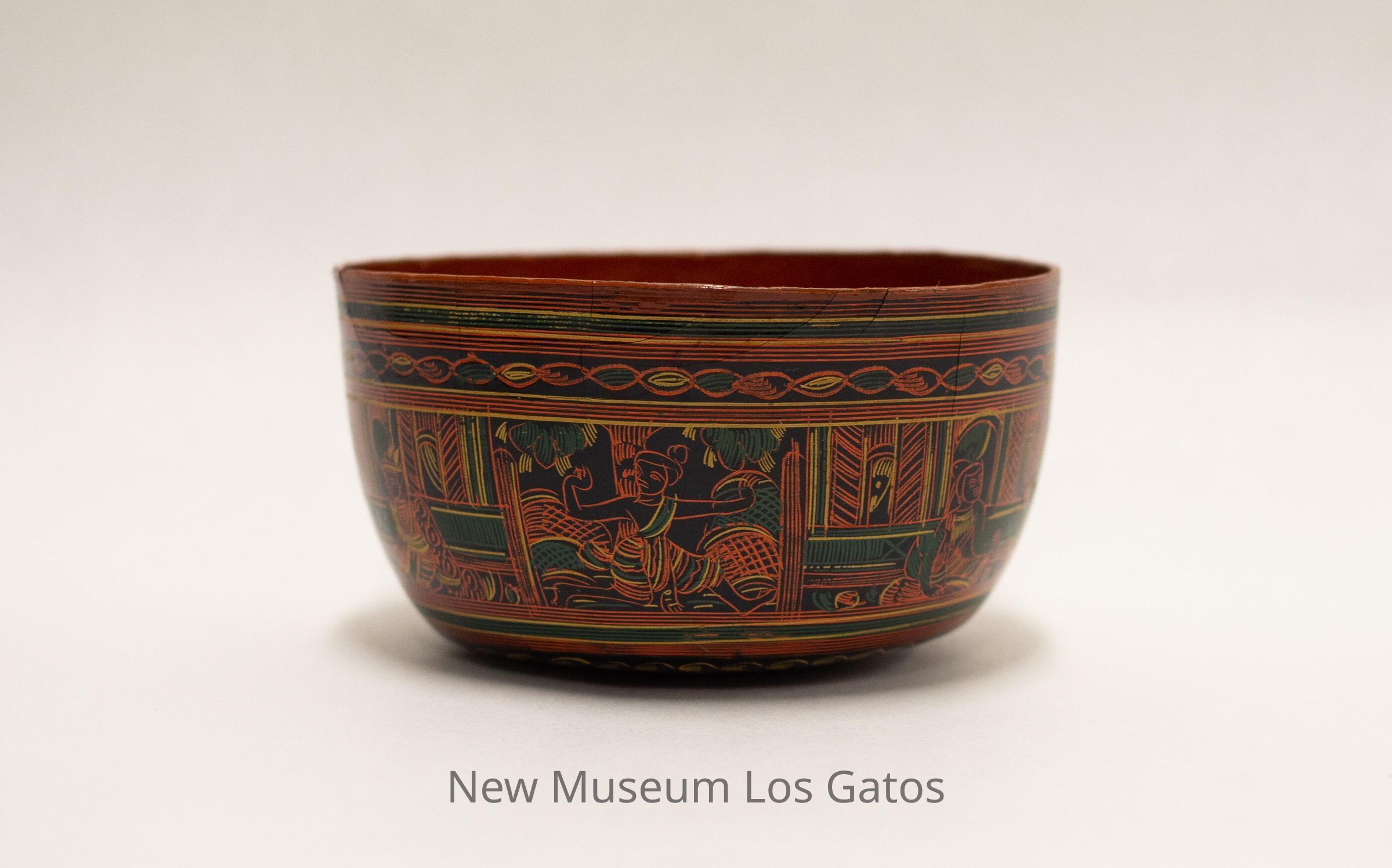 A set of three lacquer bowls. Two of the lacquer bowls are shallow and circular, and are black on the outside and red on the inside. The third bowl is larger and circular, and also red on the inside. On the outside of the larger bowl are intricate black, yellow, red, and green decorations featuring numerous seated figures as well as geometric designs.Collection