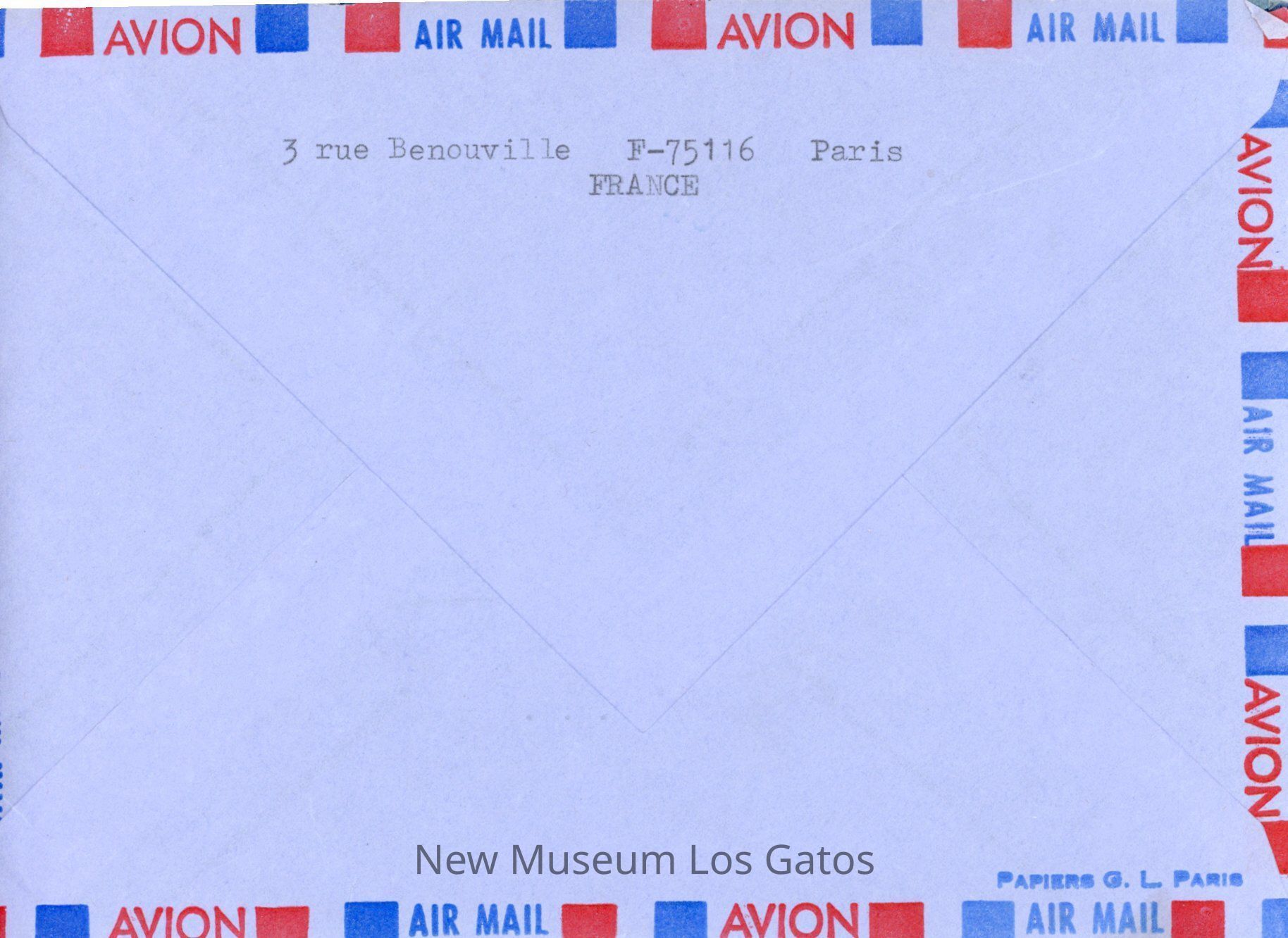 Small blue envelope, with a red and blue border around the edges. Envelope was mailed from France to the Coates. There are three stamps in the upper right corner, one blue, one green, and one red. The envelope is opened along the top edge, and there is nothing inside.Collection