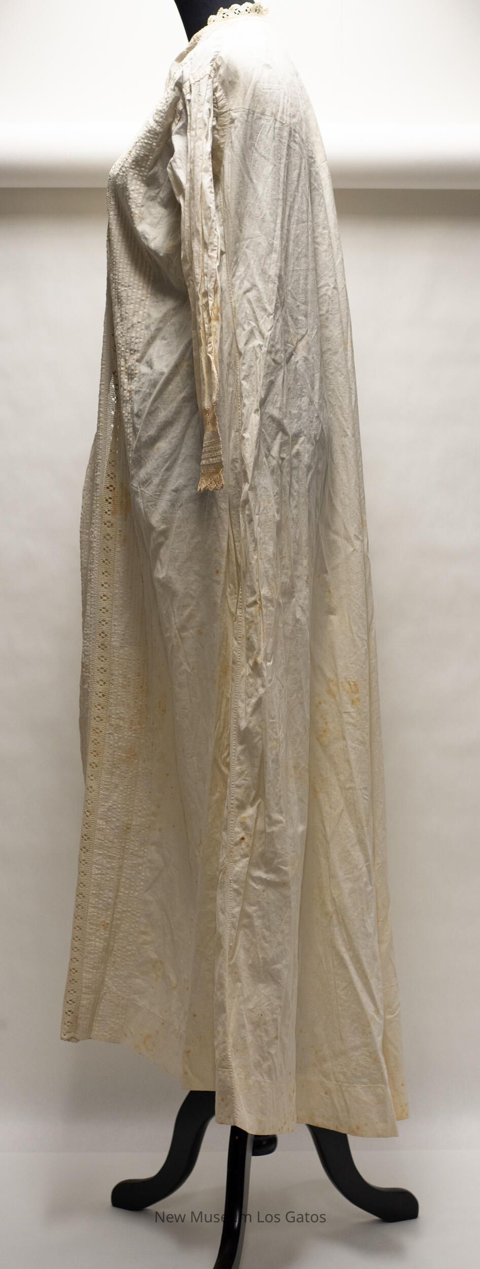 A long, cotton dress that buttons up in the front with small, iridescent white buttons. There are two horizontal bands of lace and one horizontal band of french pleats at the bottom of each sleeve, two vertical bands of french pleats and one vertical band of lace on each side of the front. There is also lace around the collar.Collection
