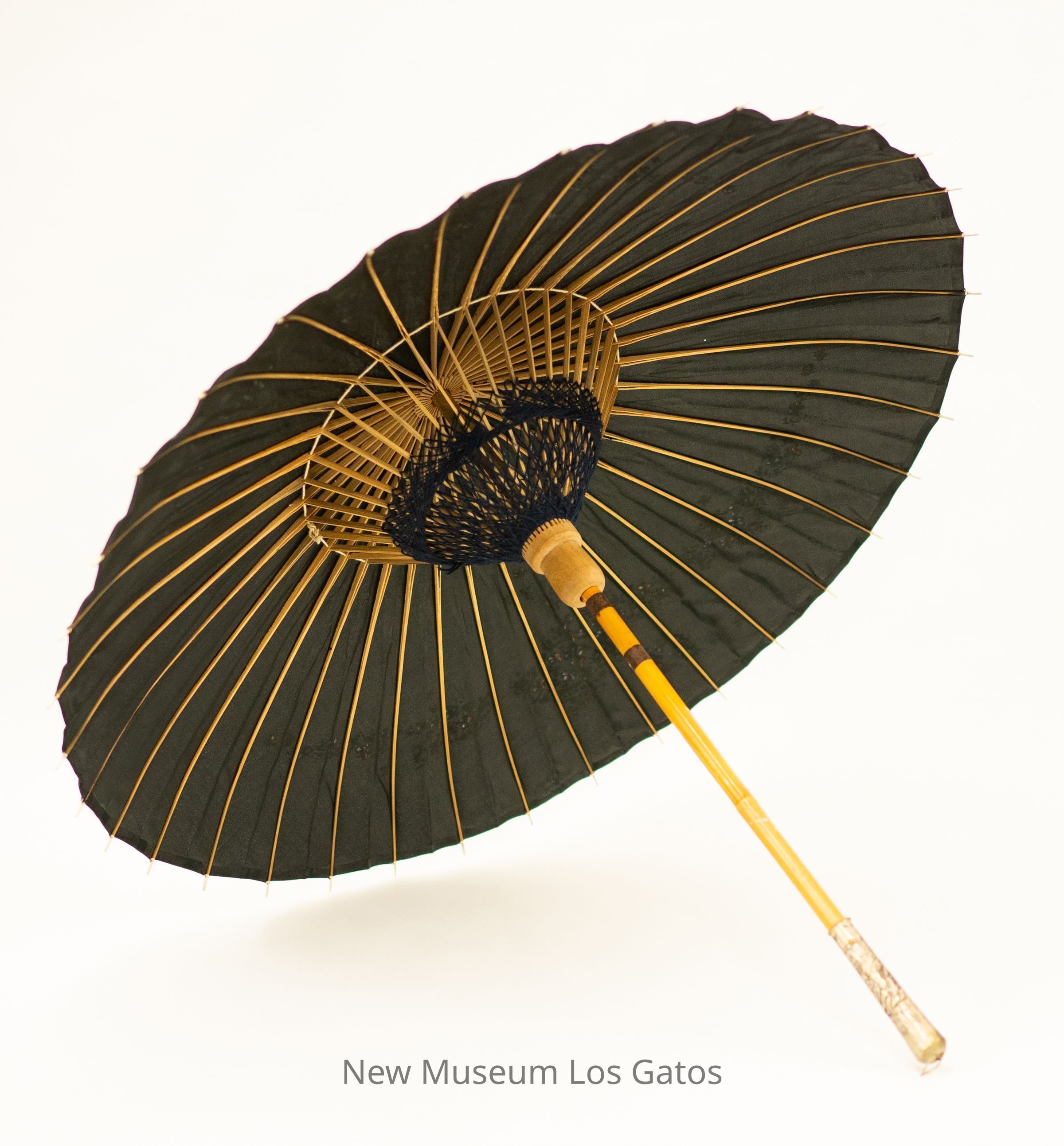 A collapsible black parasol, with a wooden stick and handle. The umbrella cloth is black, with a hand-painted green, white, blue, and pink floral pattern on the top. The point of the umbrella is painted black, with gold and silver script painted on it, possibly in Burmese. The stick portion of the handle is a light brown wood, while the base of the handle is metal, with an engraved floral pattern on it. The interior of the umbrella is supported with wooden supports, around which black string is woven.Collection