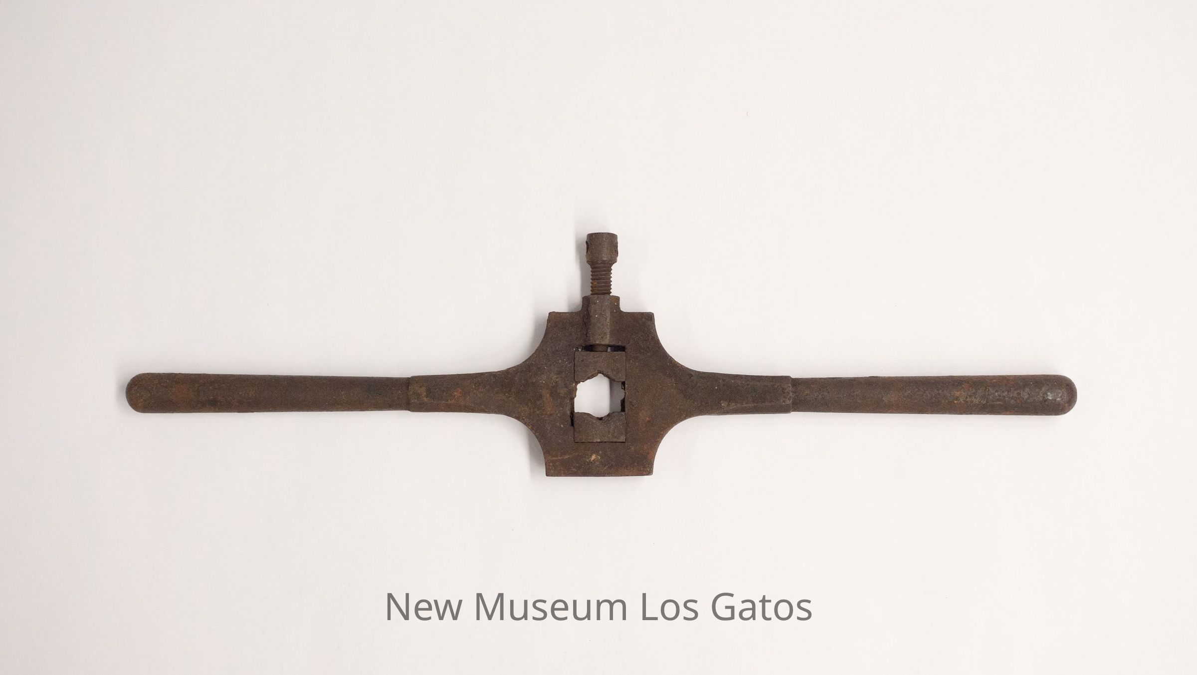 A double-handled metal tool. There is a center square area, with one cylindrical handle on each side. The the center square, there two smaller moveable metal parts, with the top one attached to a screw-top.Collection