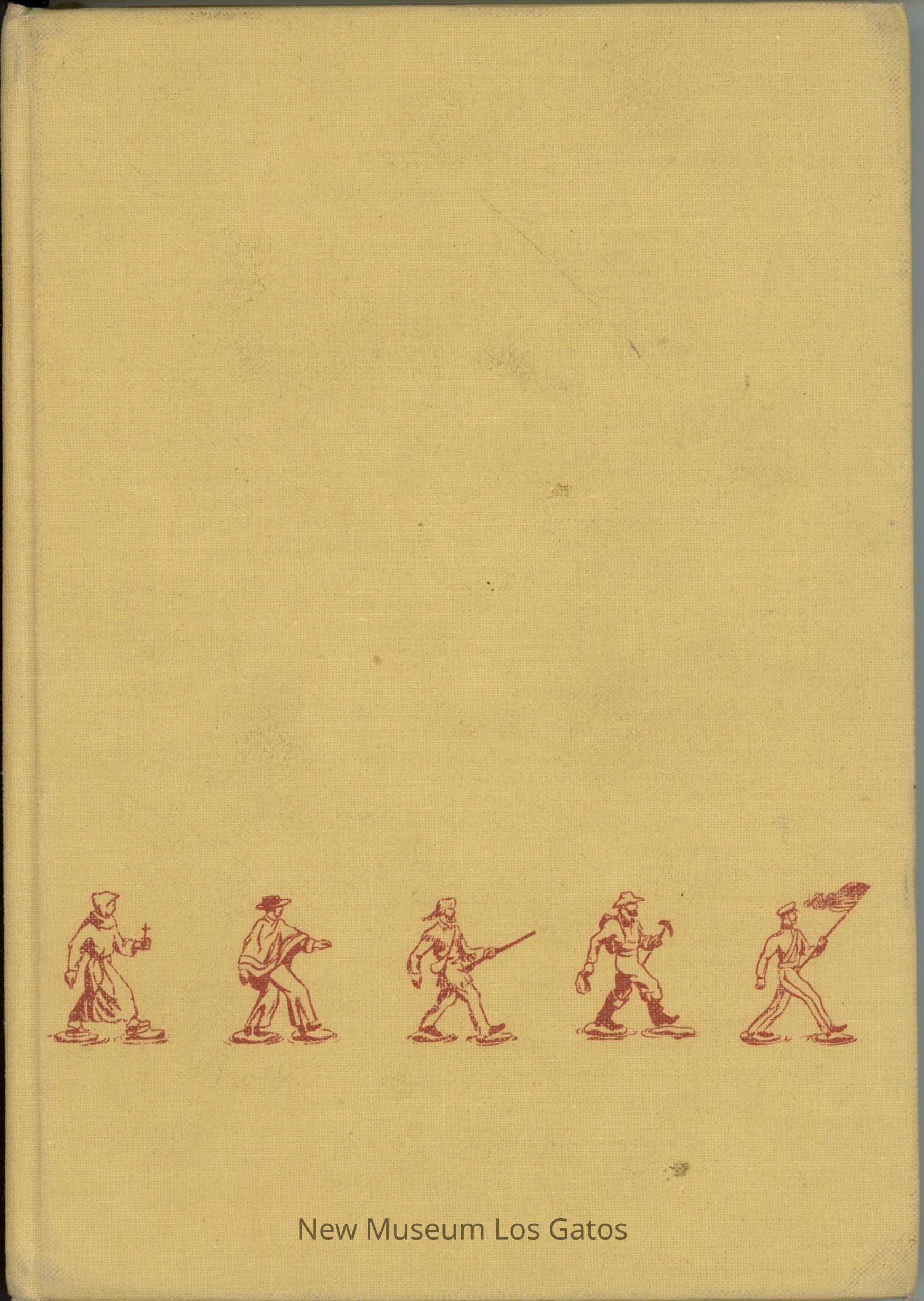 A tan, fabric-bound book with red illustrated people walking in a pattern near the bottom of the covers, featuring stories about the history of California appropriate for young readers.Collection