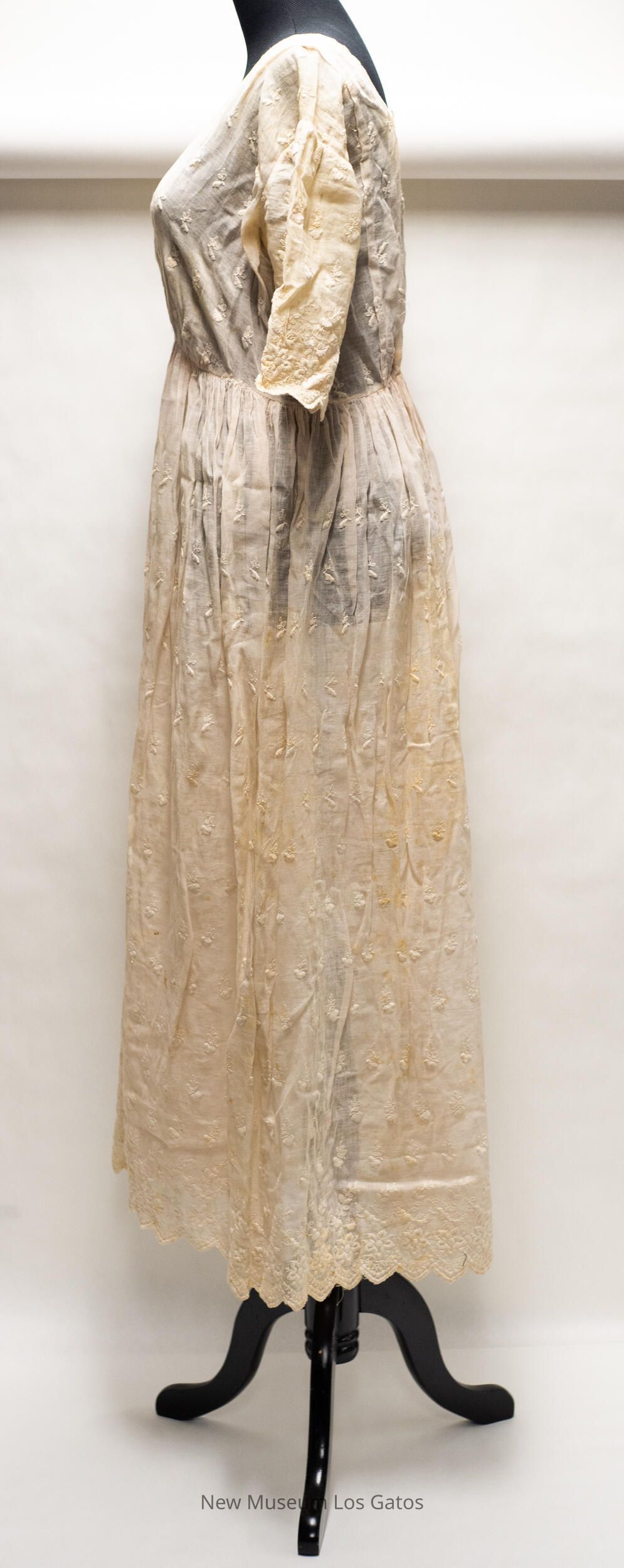 A long, white linen day dress that cinches at the waist. There is an embroidered floral pattern throughout the dress, with more heavily concentrated, intricate floral embroidery along the hem, the bottom of each sleeve, and along the neckline. The hem of the dress, as well as the bottom of the sleeves, and the neckline, are cut in a pointed/triangular pattern. The dress opens along the left side of the back, and closes with two metal snaps.Collection